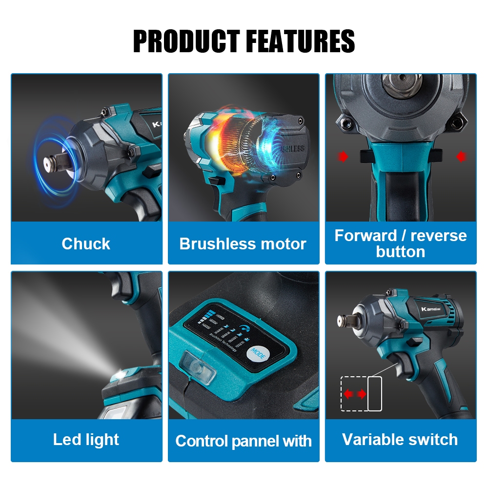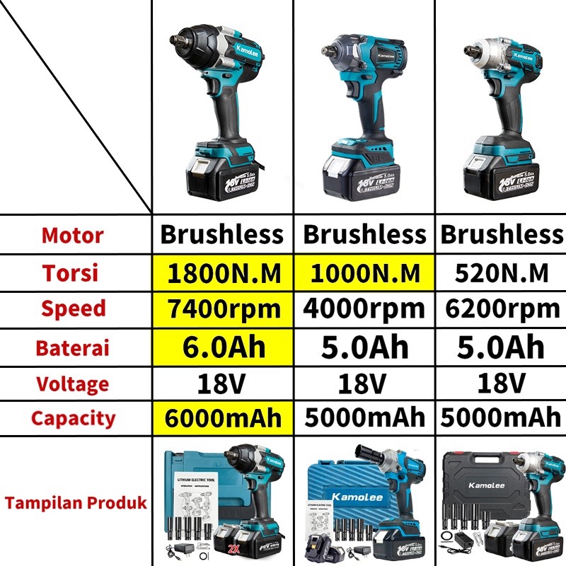 Kamolee 1800N.M/1200N.M/520N.M High Torque Impact Wrench 1/2”1/4” Electric Wrench for Auto Repair Battery + Toolbox
