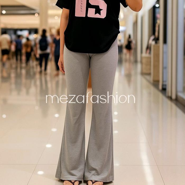 Flare Pants Cutbray Rib Knit Stretch Wanita Celana Panjang Highwaist Casual - Hitam