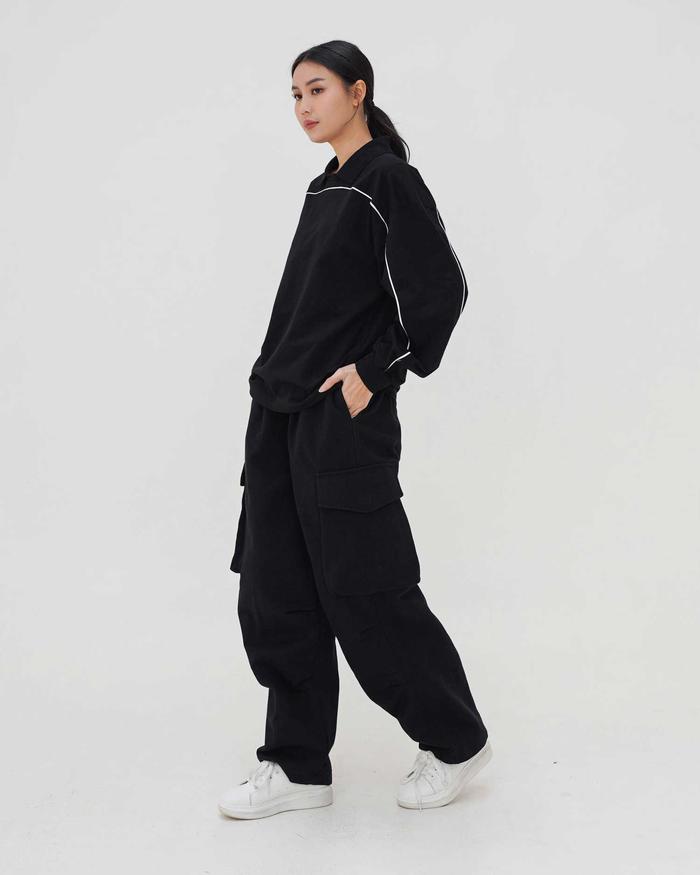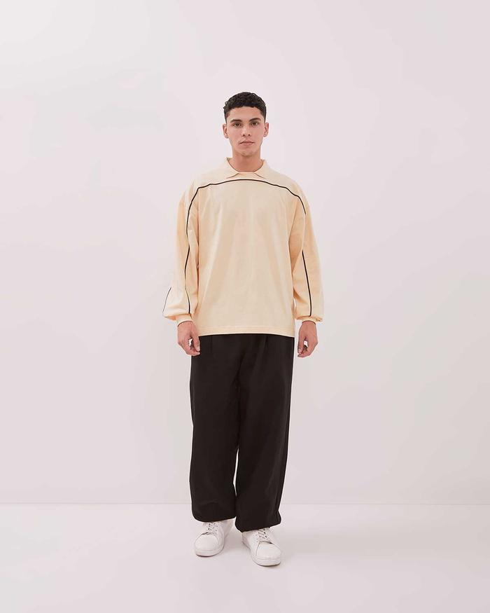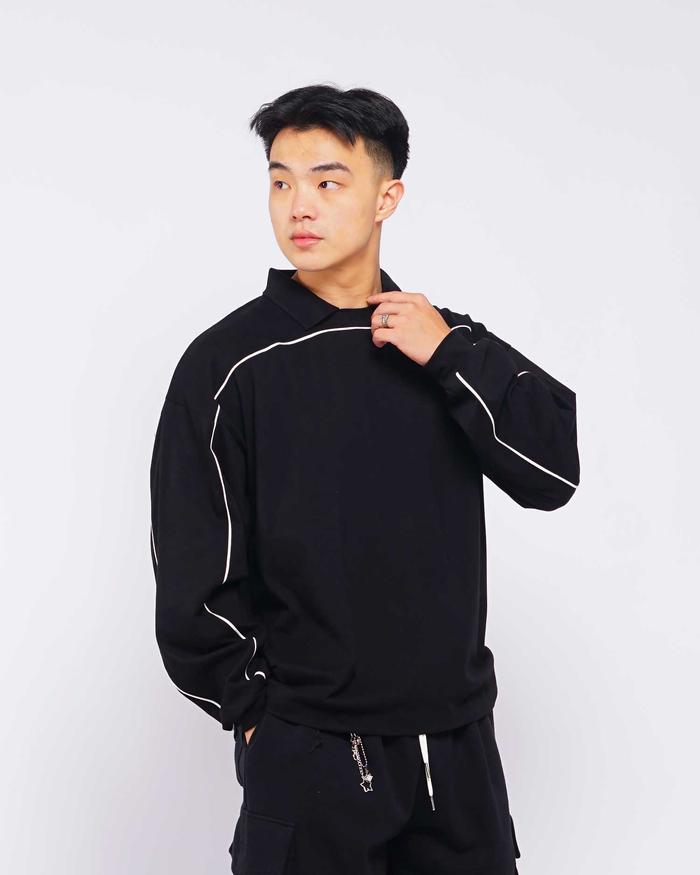 Boxy Piped Polo Long Sleeve - Polo Lengan Panjang Boxy Berlis Abyad Apparel Pro Project - Black, S