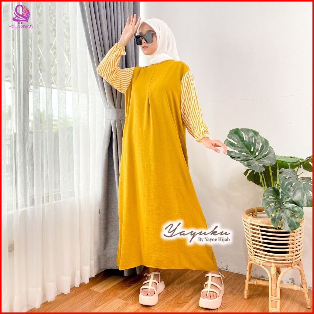 Paket 2 Pcs Nayla Dress Kombinasi Salur Polos Gamis Kekinian Simple Fashion Muslimah