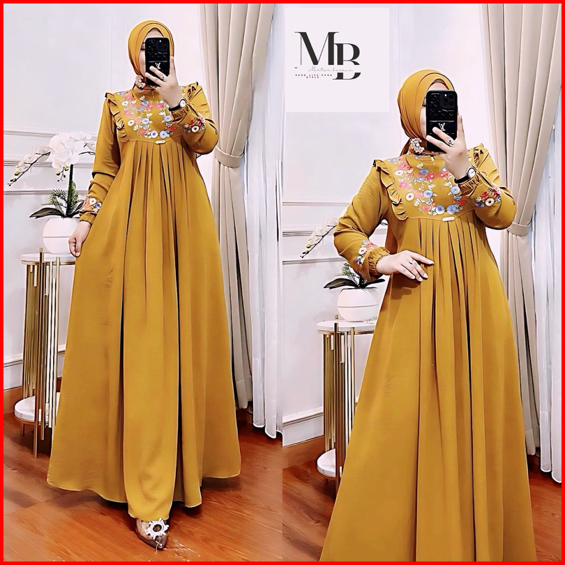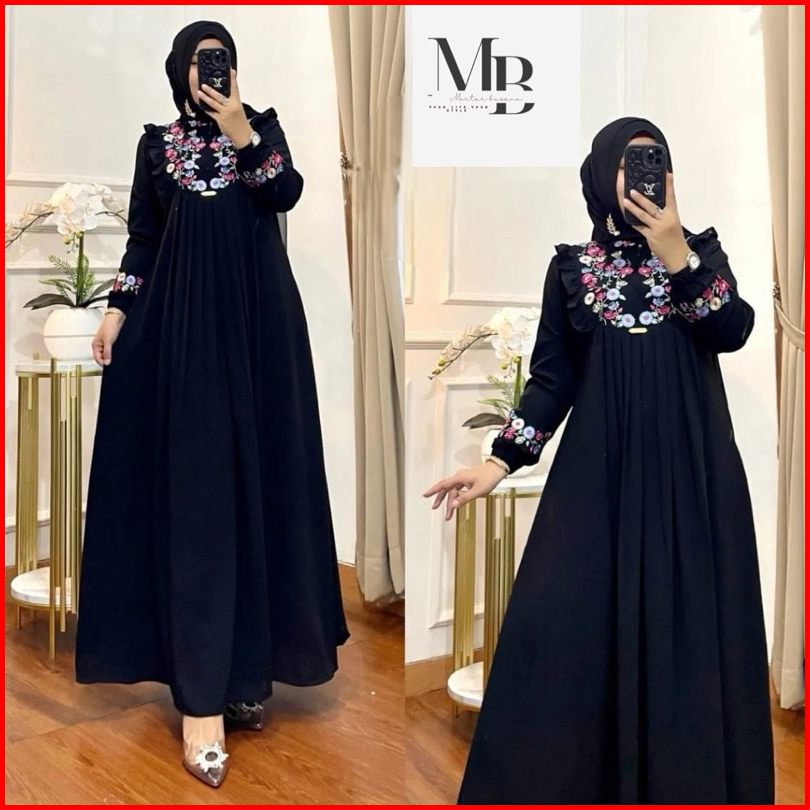 Gamis Azizah Bordir Motif Bunga Timbul Bahan Crinkle Airflow Terbaru