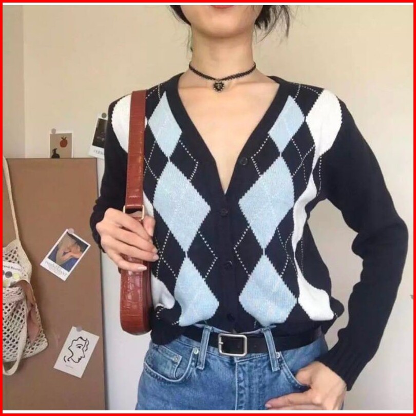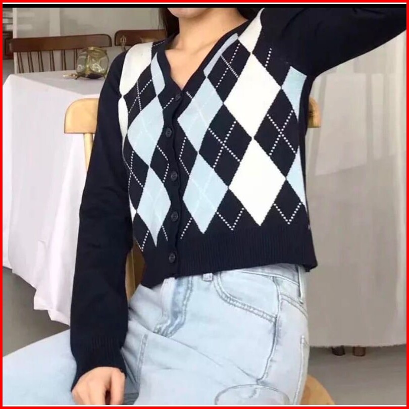 V Neck Ketupat Cardy Kardigan Rajut Premium
