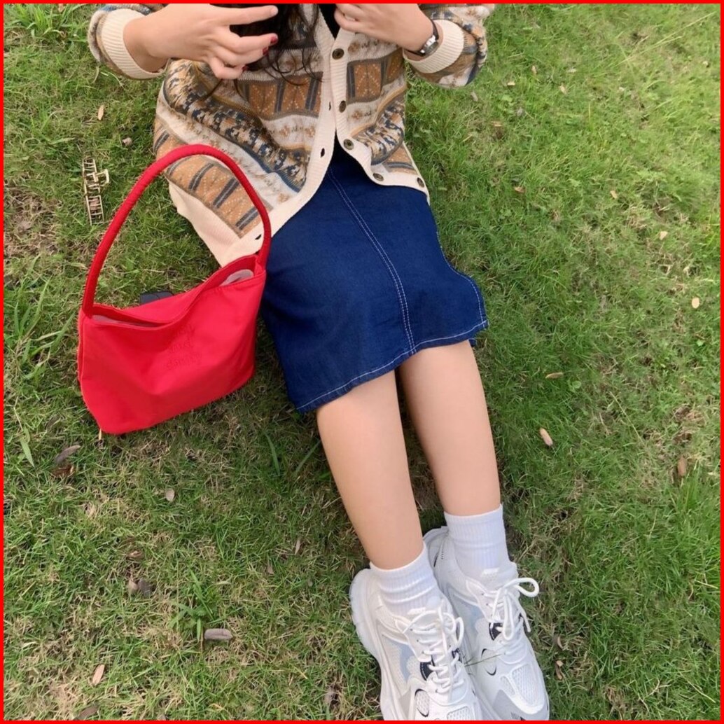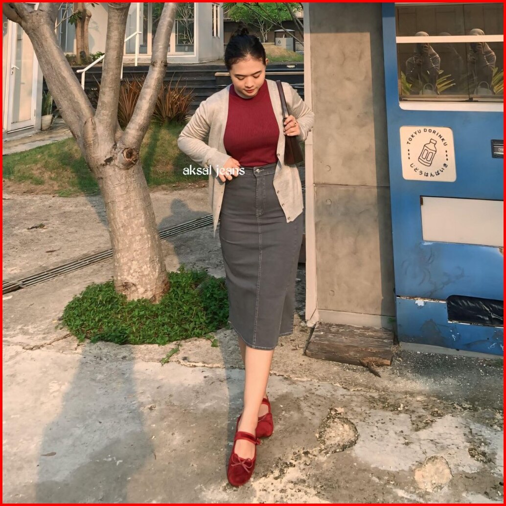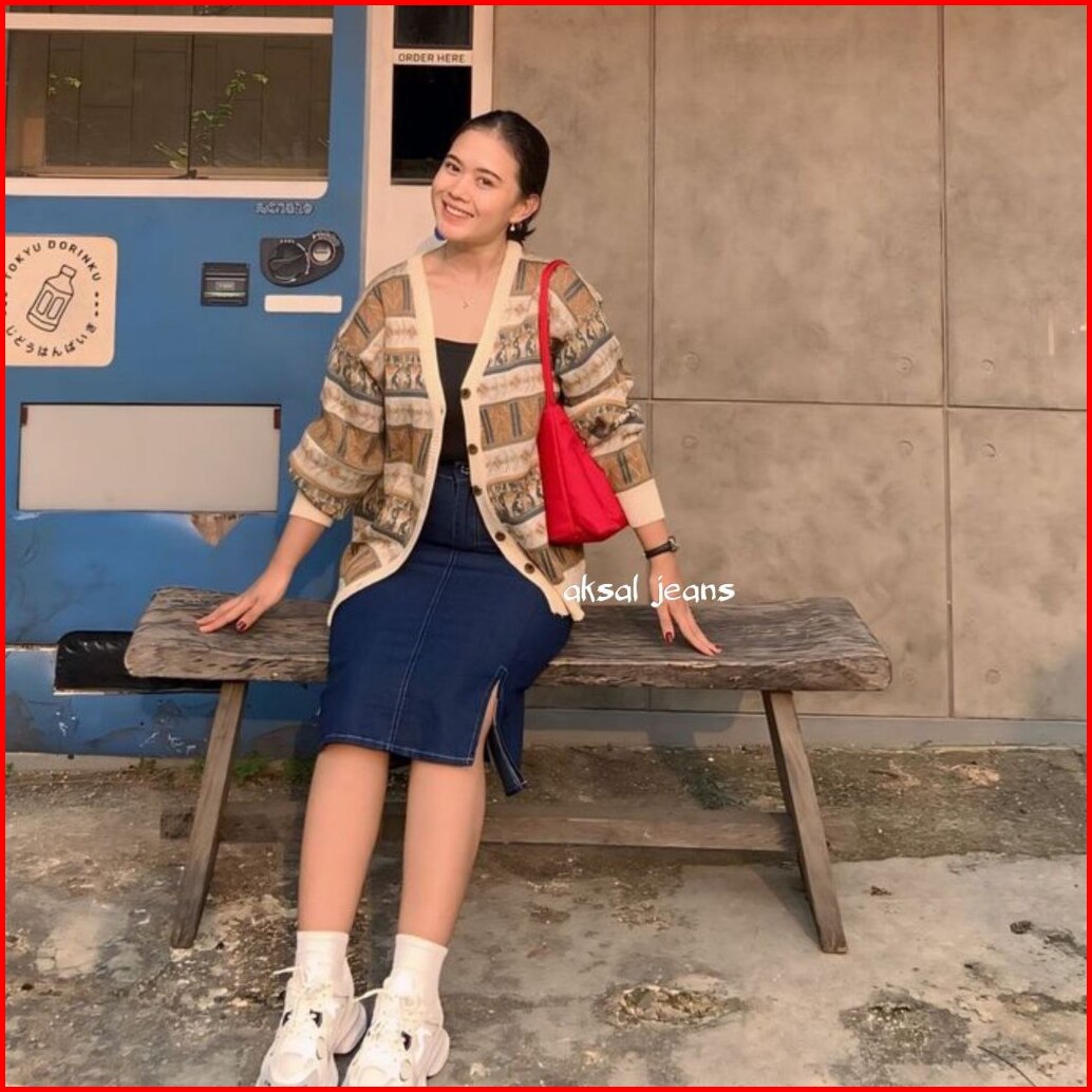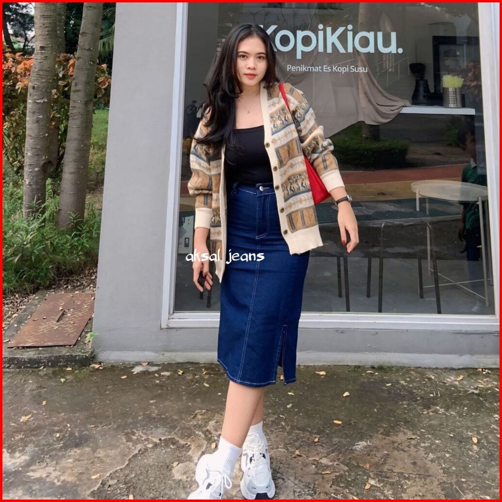 Rok Jeans Higwaist A-line Panjang 7 8 Belah Samping Pinggang Karet Korean Style Terbaru Aksal Jeans