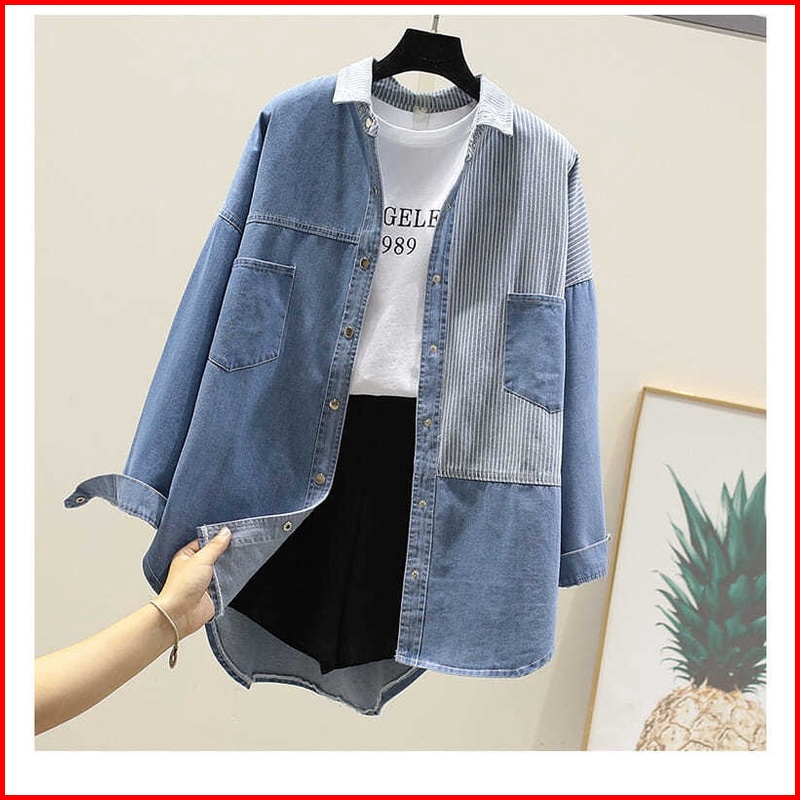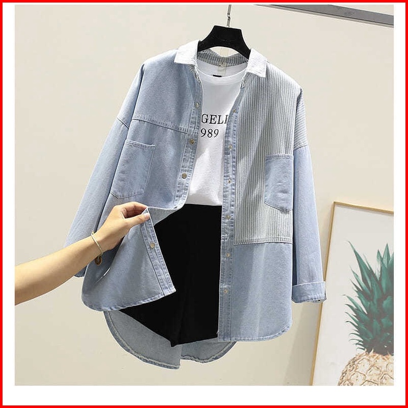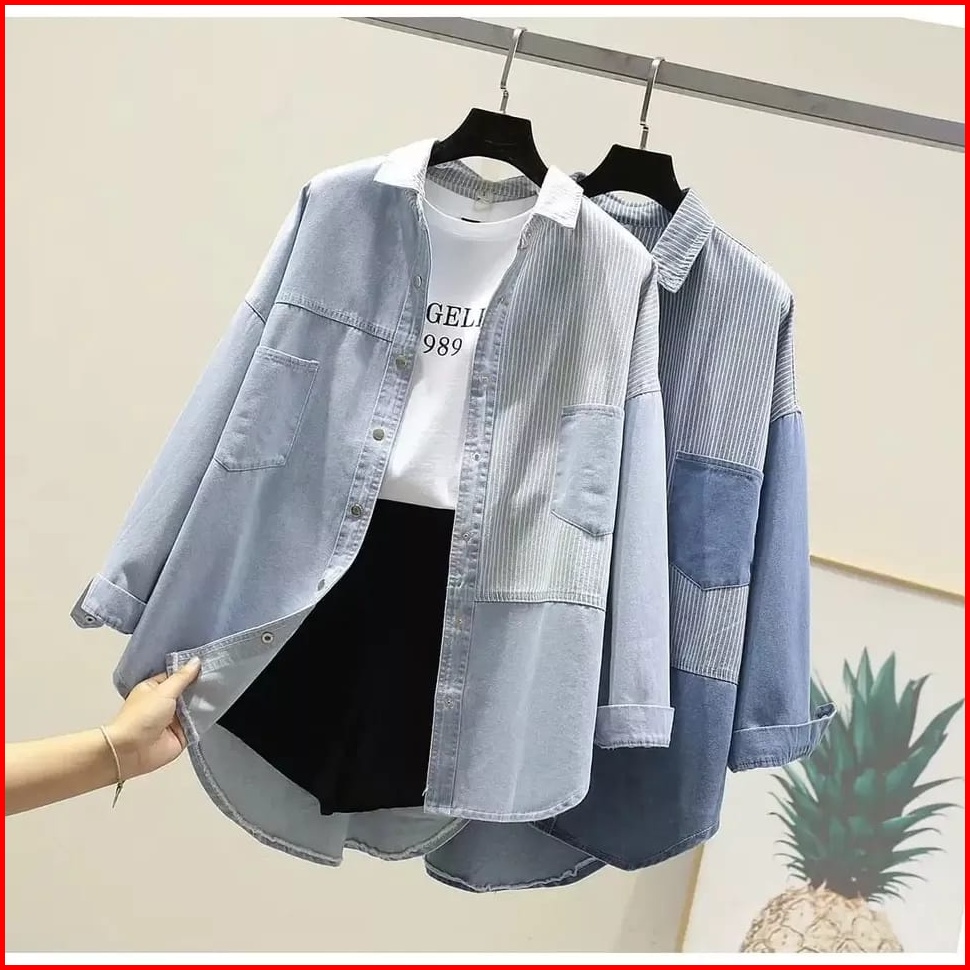 960 - Kemeja Jeans Denim Atasan Wanita Kombinasi Salur
