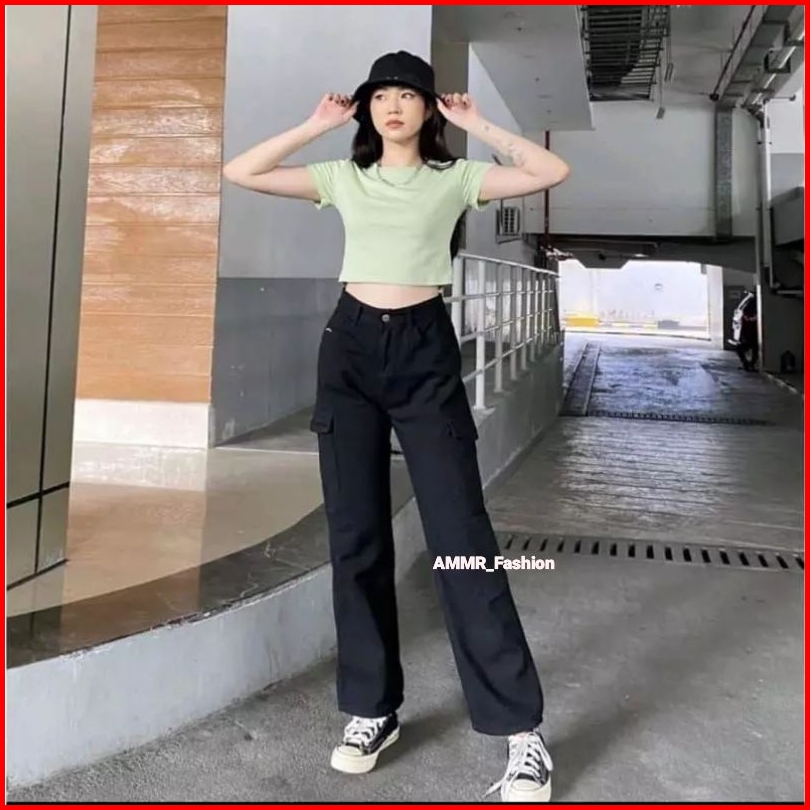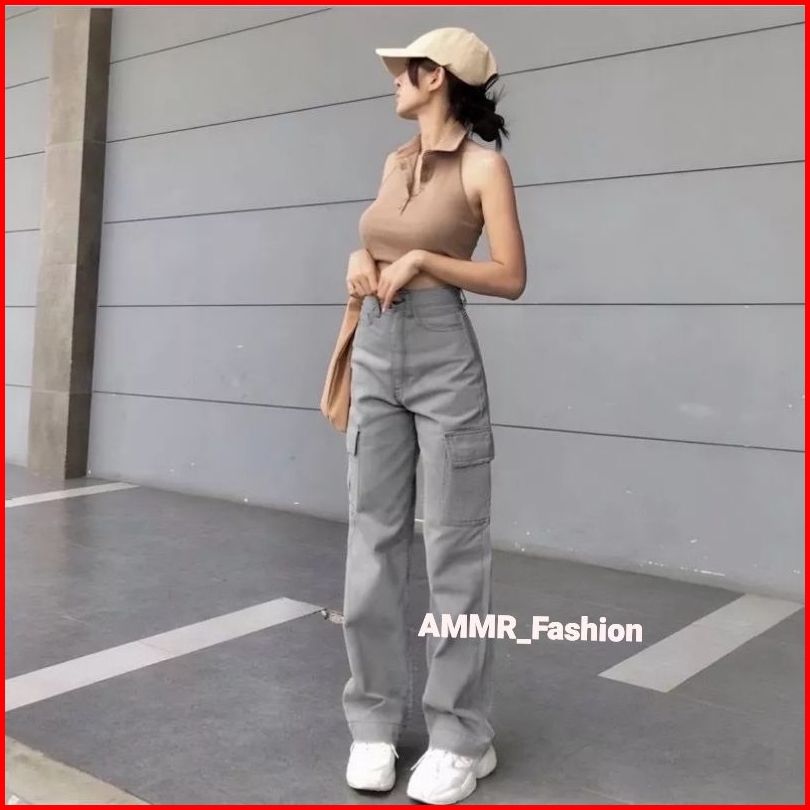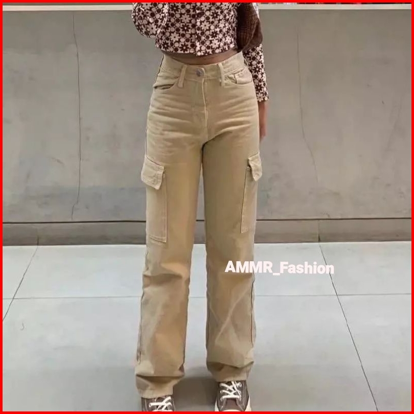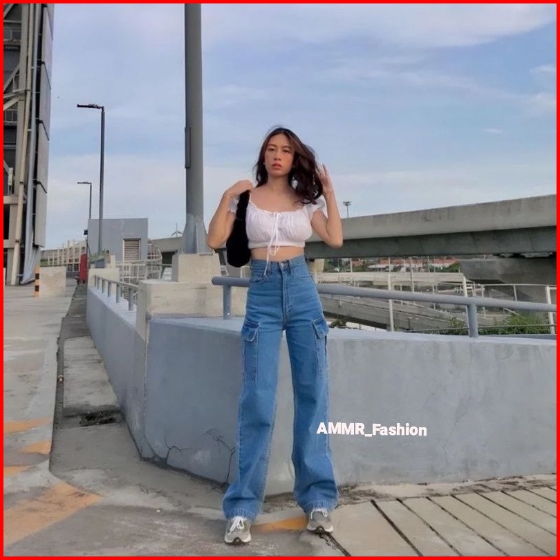 Celana Jeans Wanita Cargo Highwaist Kulot Loose