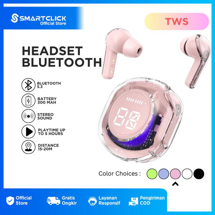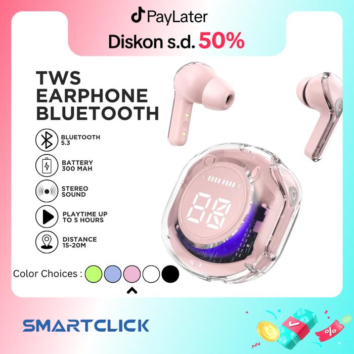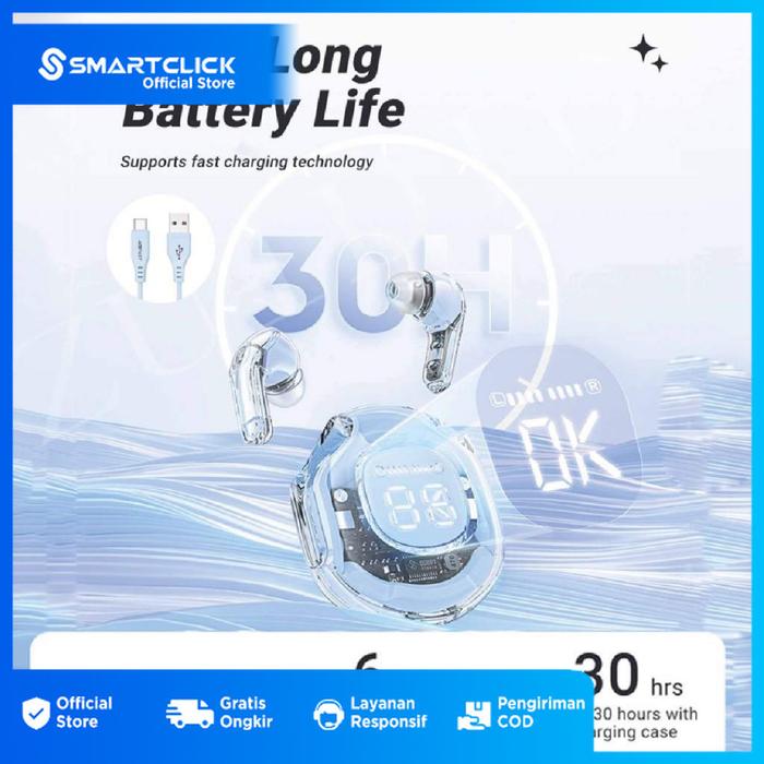 HARGA MIRING ! SMARTCLICK HEADSET BLUETOOTH TWS LED DISPLAY TRANSPARAN HIFI EXTRA BASS SMART TOUCH - WHITE MURAH