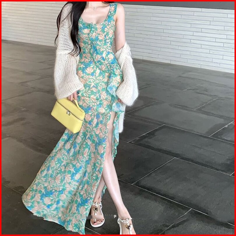 Emita Bloom Baju Flowy Midi Dress Pantai Panjang Bunga Bunga Wanita Floral Dress Biru Muda Natal Korean Style Big Size J