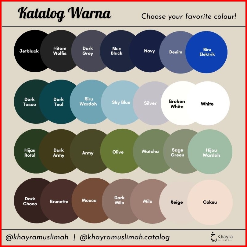 Jetblack Hitam Pekat, Hitam wolfis, Dark Choco, Hazelnut, Navy, Maroon, Mocca, Hijau Botol, Dark Army, Dusty Pink, Lavender, Dark Grey, Abu Zinc, Silver, Dark Teal, Sage Green, Mauve, Nude, Deep Taupe, Dove, Dark Purple, White, Broken White, Denim, Warna Lainnya