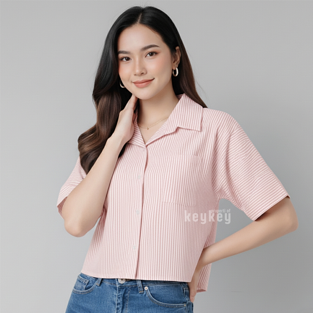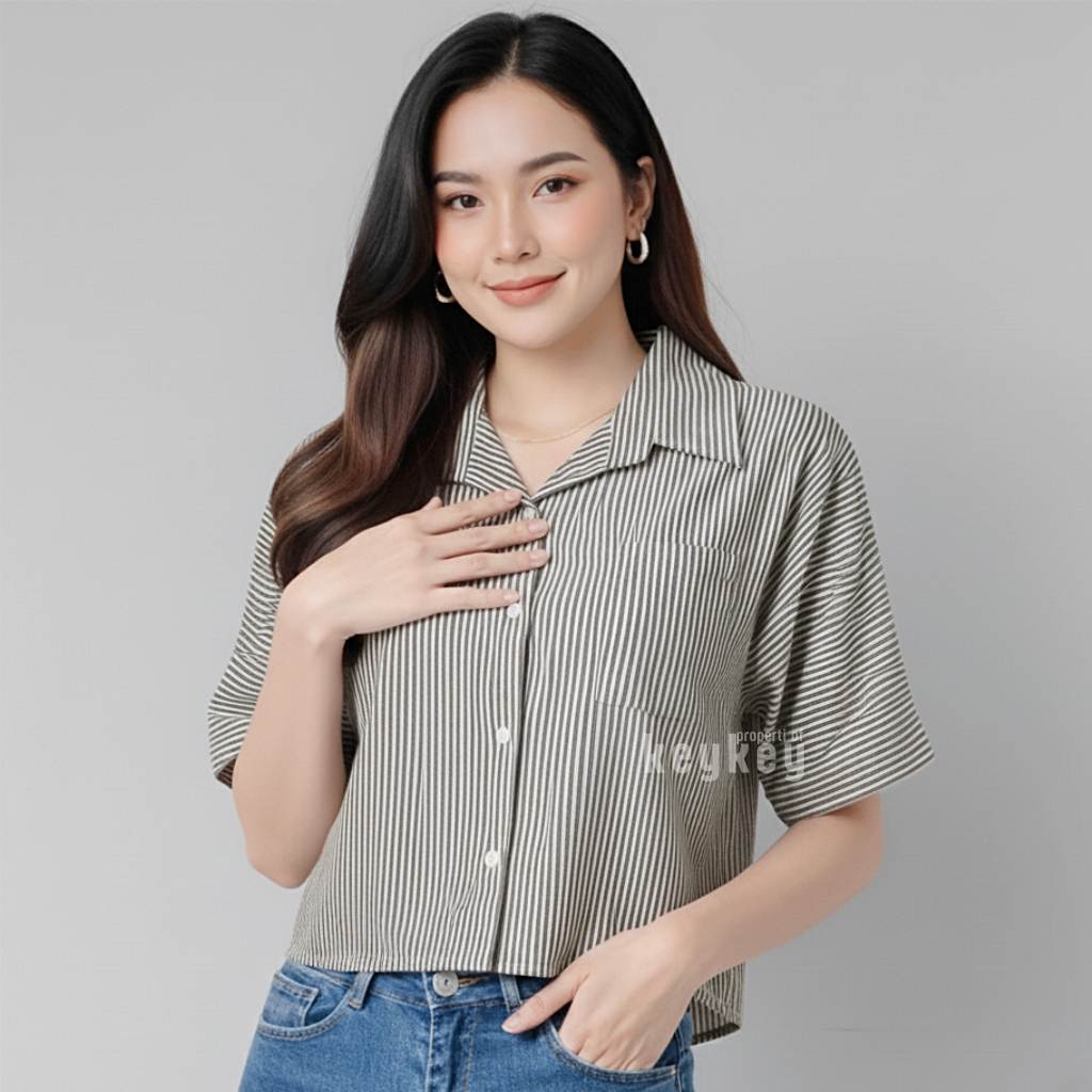 KEMEJA PENDEK WANITA CLEA | Kemeja Wanita Stripe Semi Crop Top Lengan Pendek | Atasan Kemeja Katun Poly PE Semi Crop
