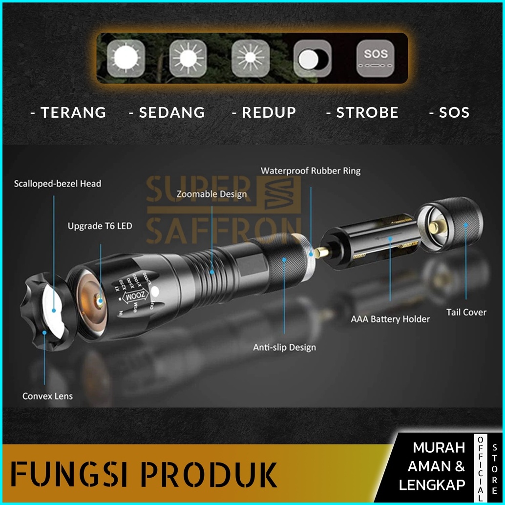Wewant Senter Super Terang Waterproof Led Tactical Anti Air Lampu Swat Zoom Murah Free Charger