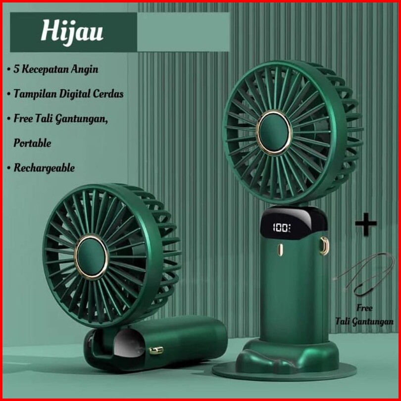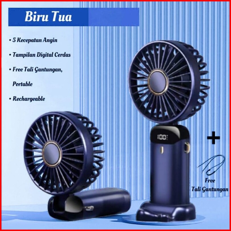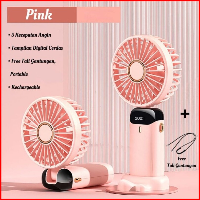 Kipas Angin Genggam Mini Lipat Fan Lucu Led Display 18650 Lithium Baterai Gratis Gantungan Tali Leher 5 Kecepatan Handhe