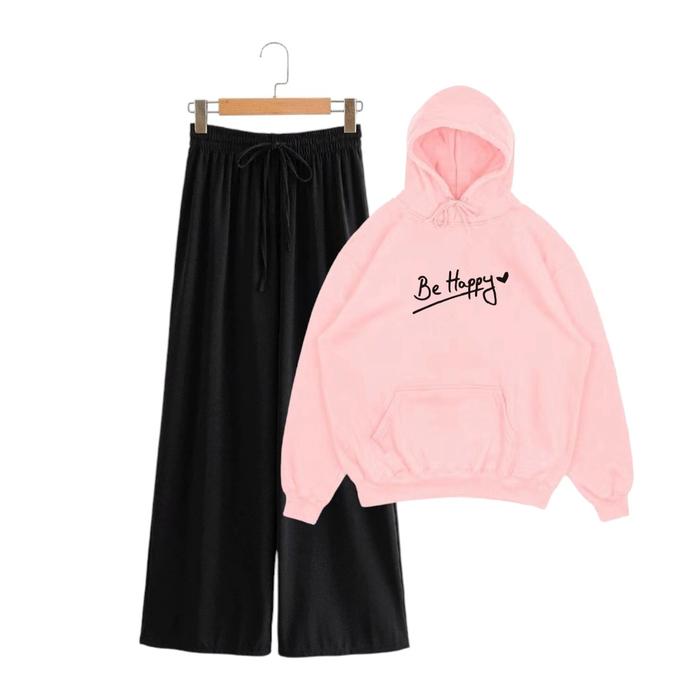 Setelan Sweater Hoodie Be Happy Wanita Remaja Kekinian Umur 10-17 Tahun Korea Style Anak Celana - Putih, L