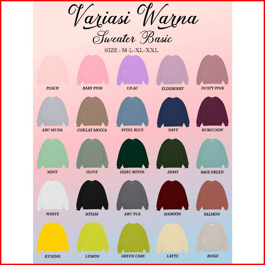 Hitam, Putih, NAVY, MAROON, Abu Tua, Beige, Lilac, COKLAT MOCCA, ABU MUDA, LATTE, HIJAU BOTOL, HIJAU ARMY, BABY PINK, Dusty Pink, SALMON, PEACH, STEEL BLUE, Olive, Mint, SAGE GREEN, Kuning, KUNING LEMON, GREEN LIME, ELDERBERRY, BURGUNDY