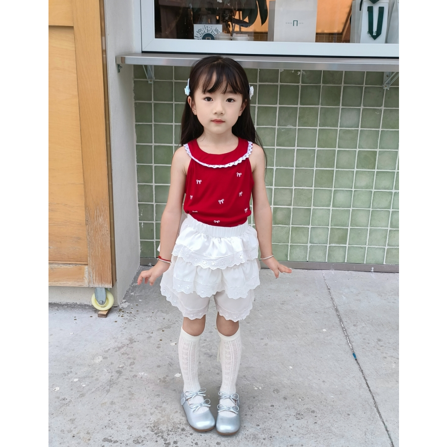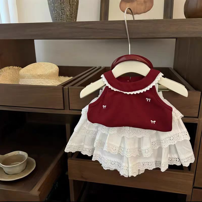 ready Setelan Anak Perempuan Korea 2025 / Setelan Musim Panas Anak / Atasan Vest Kerah Boneka Pita Merah + Rok Lapis Ren