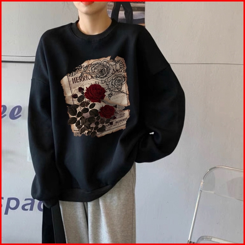 Forteid Sweater Lengan Panjang Oversize Street Style Korean Style Switer Wanita Oversize Cetakan Koran Mawar Antik Korea