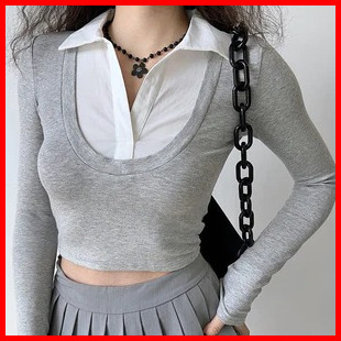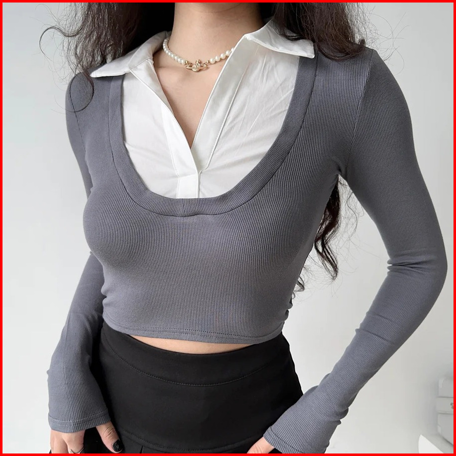 Fake Two Pieces V Collar Long Sleeve Rib Crop Top Blouse 1740 S M L Xl