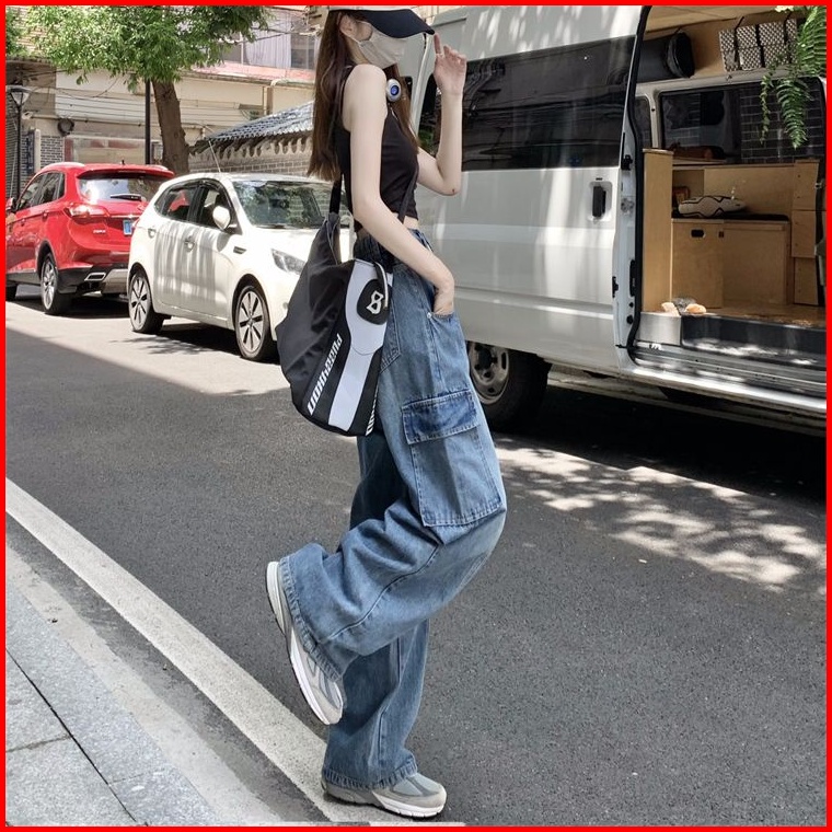 Celana Kerja Jeans Wanita Dengan Tali Serut Dan Banyak Kantong