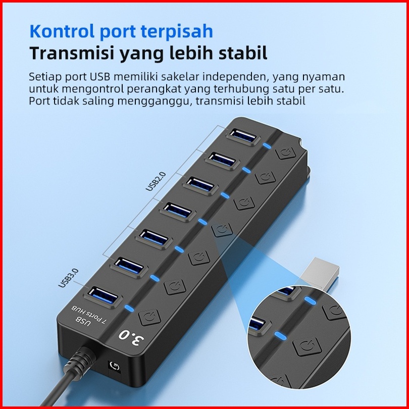 Rundycodusb Hub 4-in-1 7-in-1 Usb 3.0 5gbps Saklar Independen Kv-ad22 Black Aksesoris Desktop Laptop