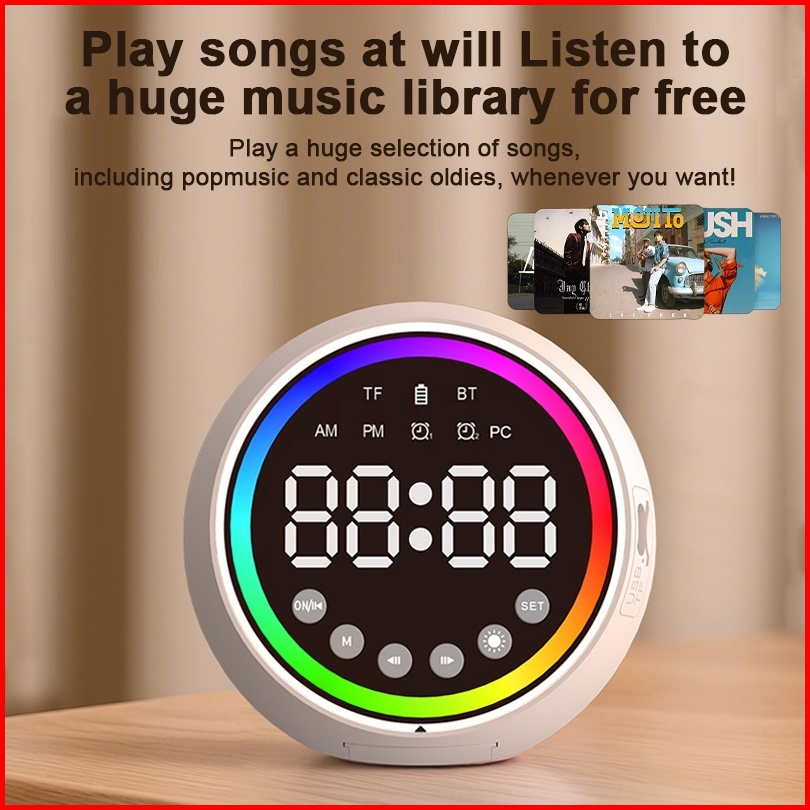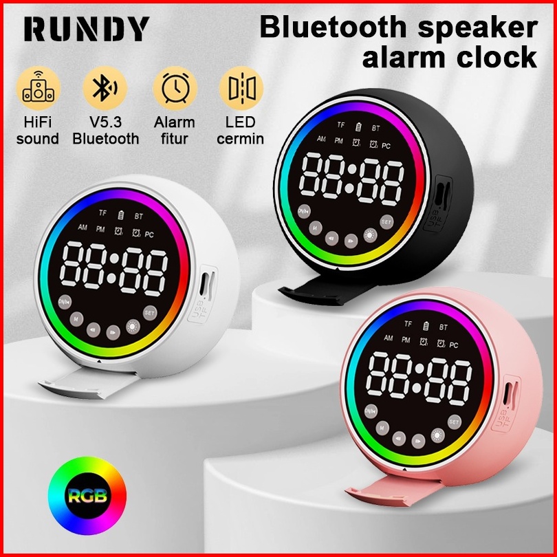 Rundycodround Bluetooth Speaker Clock With Stand 2 Alarm Display Rgb Rhythm Lights 5-8 Hour Playtime Type-c Charging Hi-