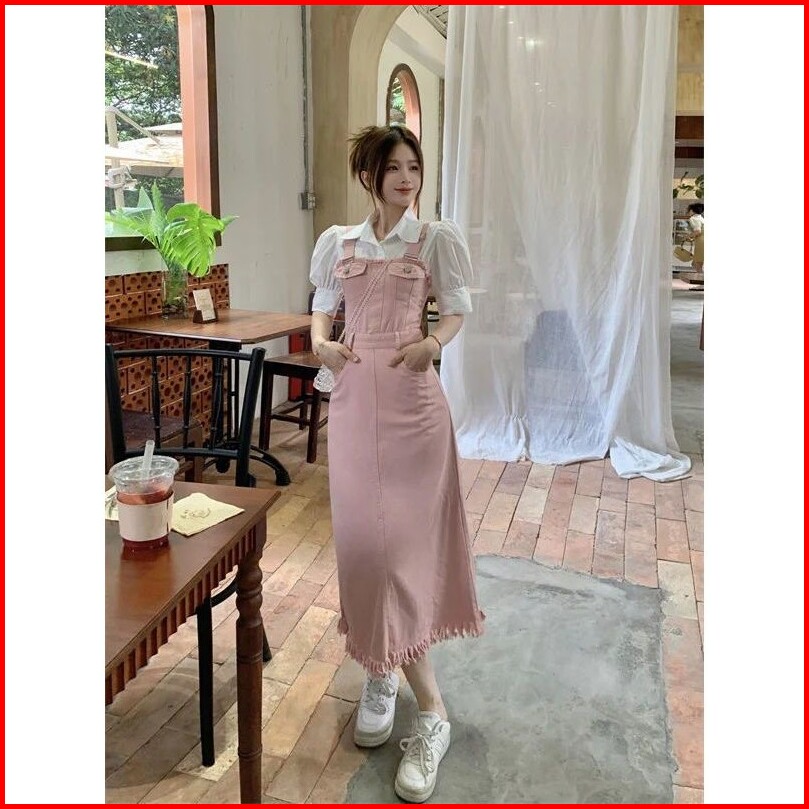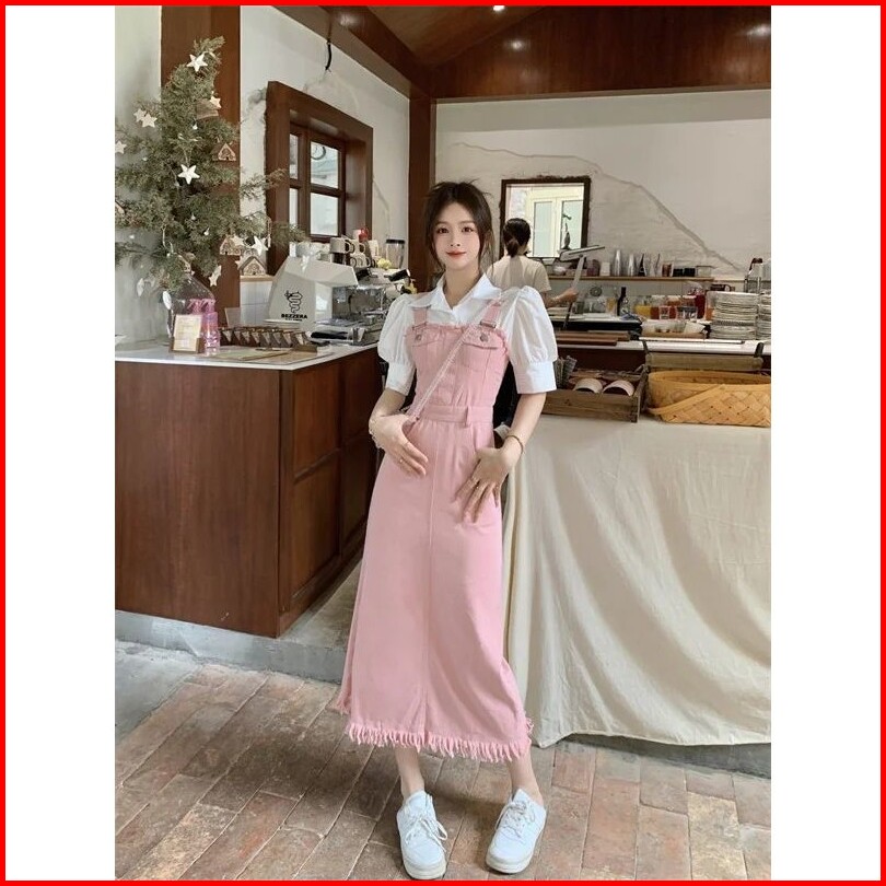 Gaun Denim Merah Muda Wanita