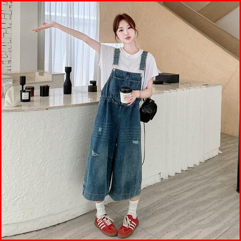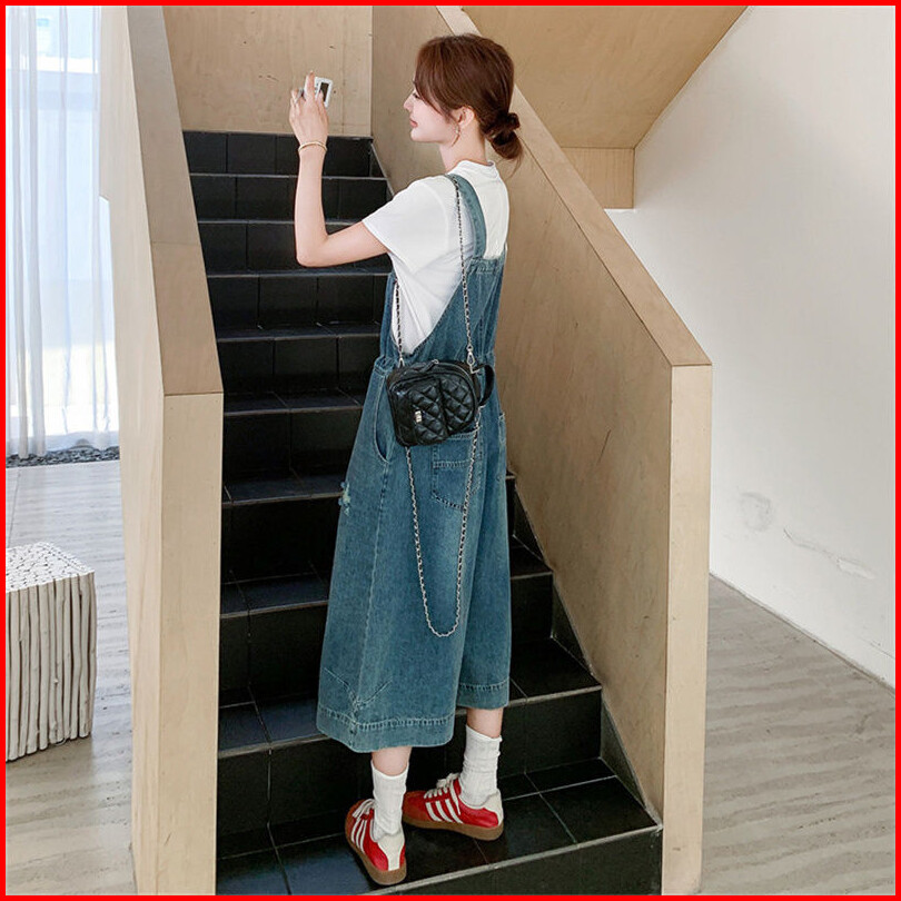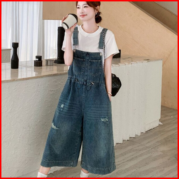 Celana Jumpsuit Wanita Denim Santai Tali Renda - Chino Pendek 3 4 Longgar
