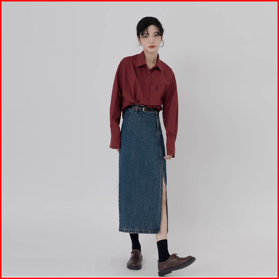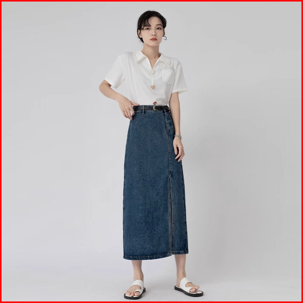 Penawaran Istimewa Biru Laut Highwaist Rok Midi A-line Fit Stretch Serbaguna Rok Jeans