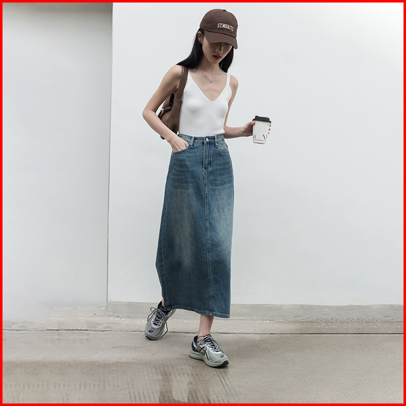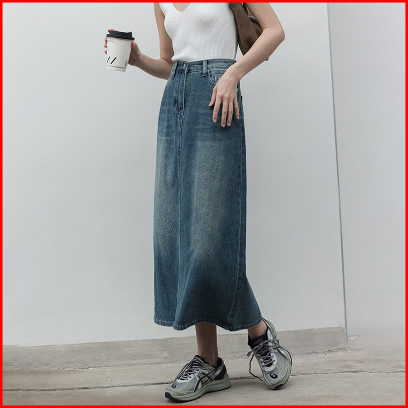 Rok Jeans Biru Retro Rok Midi A-line Highwaist Import