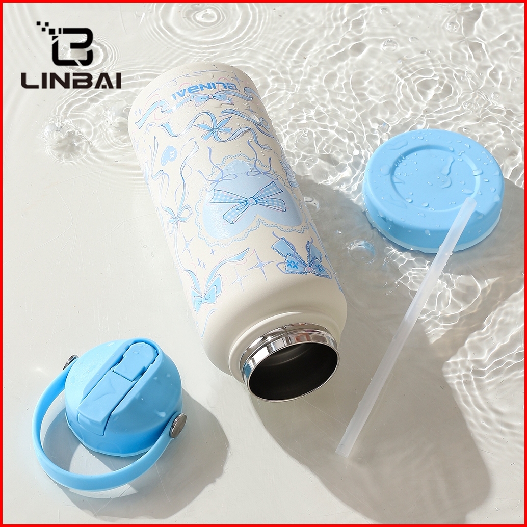 Linbai Flask Pink Butterfly 32oz Stainless Steel Thermos Cup Water Bottle With Straw And Boot Cup Hot And Cold Vacuum In