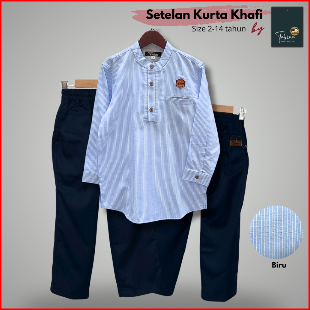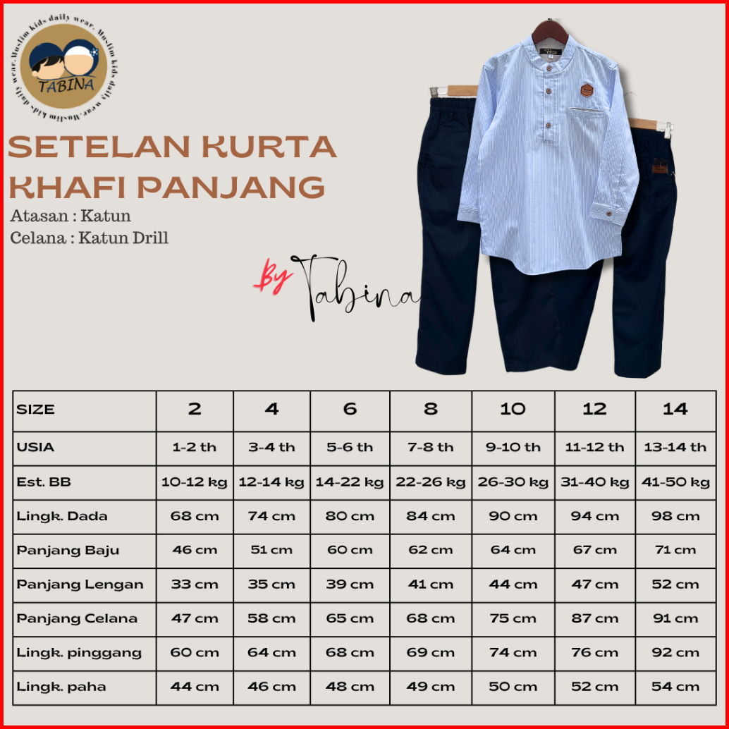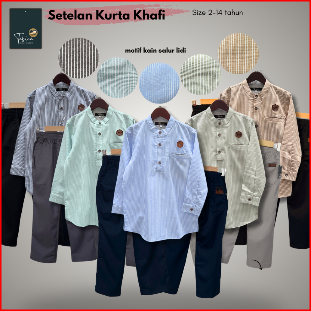Setelan Kemeja Kurta Salur Lengan Panjang Anak Laki - Remaja Tabina Seri Khafi Usia 2 Hingga 14 Thn