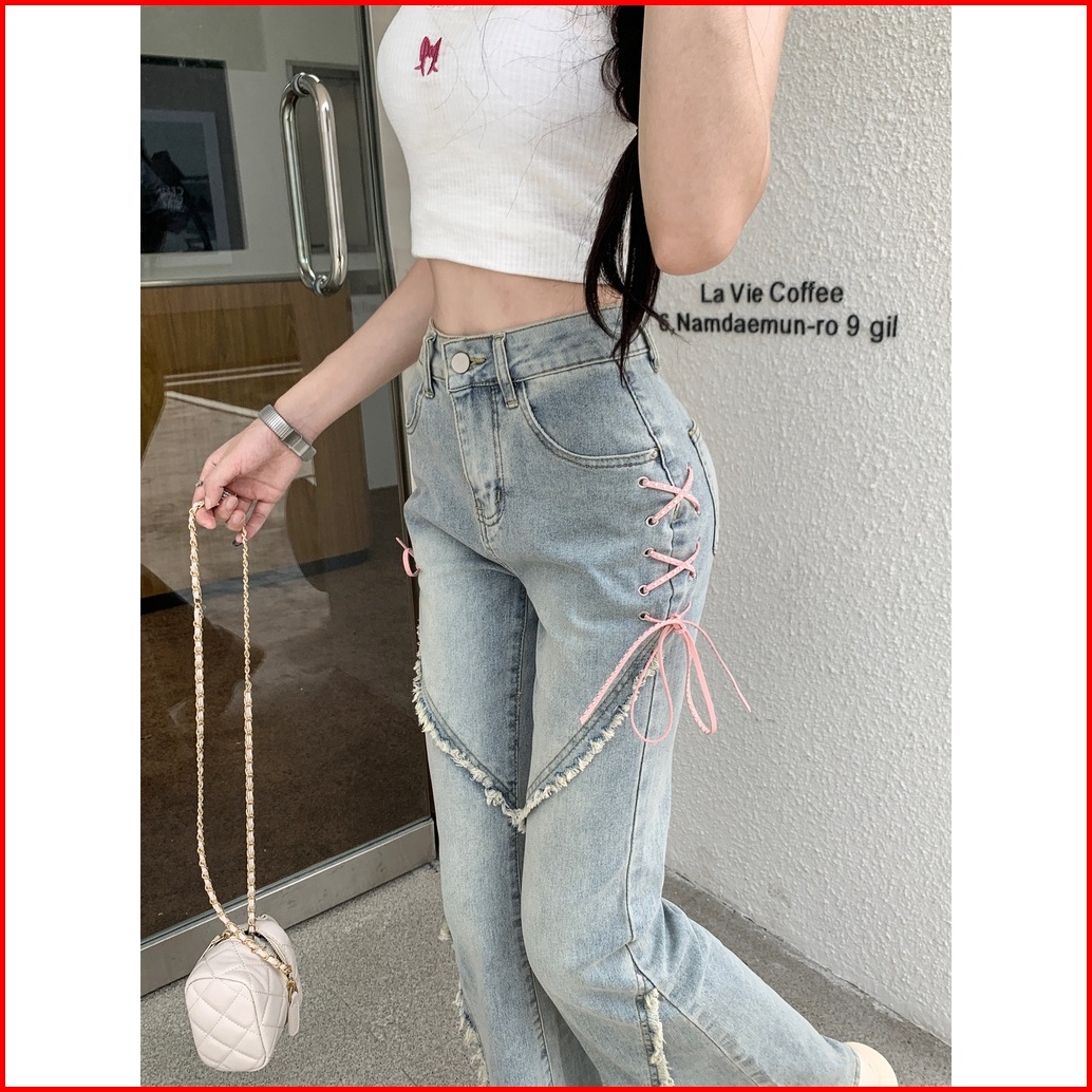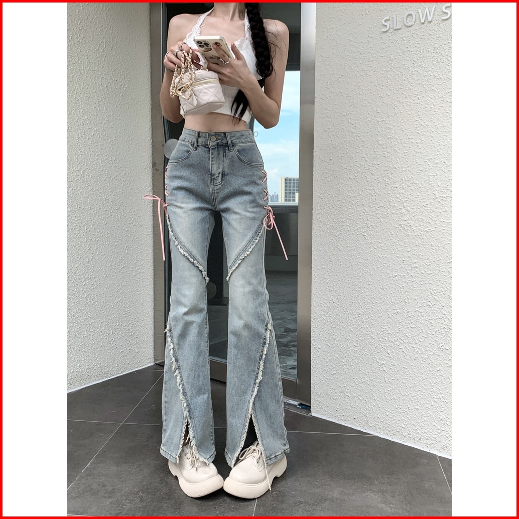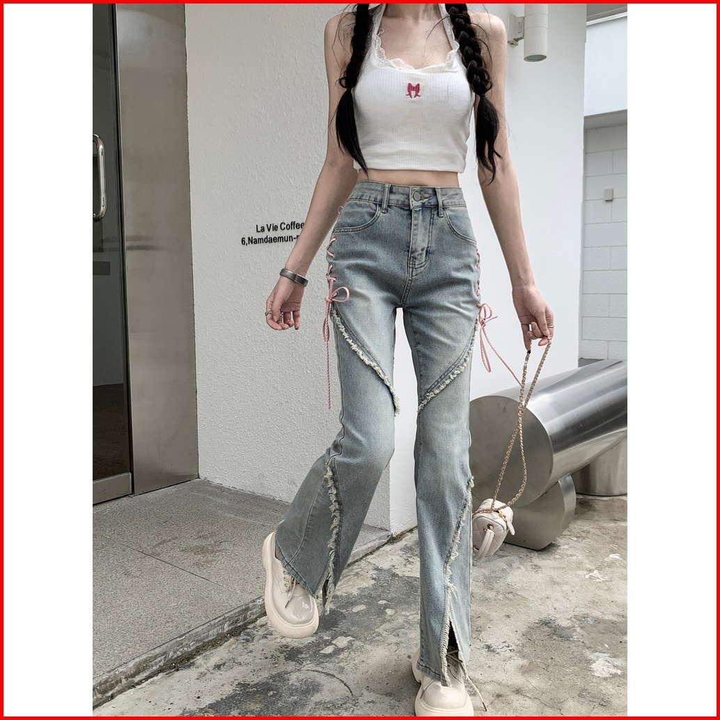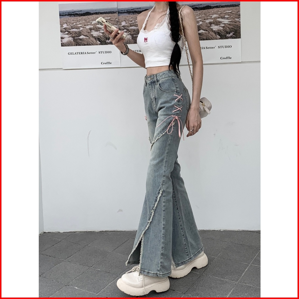 Jeans Denim Berpinggang Tinggi Bercelah Bertali Untuk Busana Retro Wanita Kecil