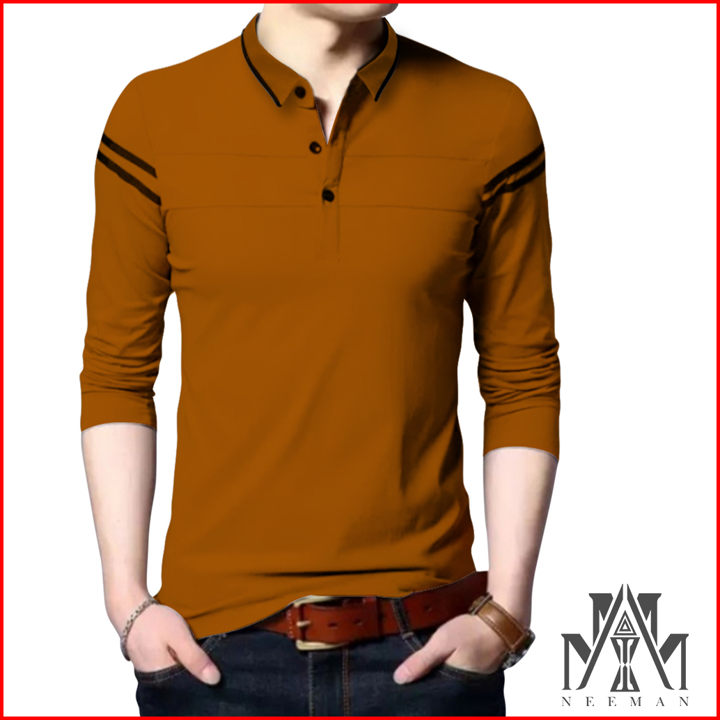 Kaos Polo Pria Kerah Daun Garis Lengan Panjang