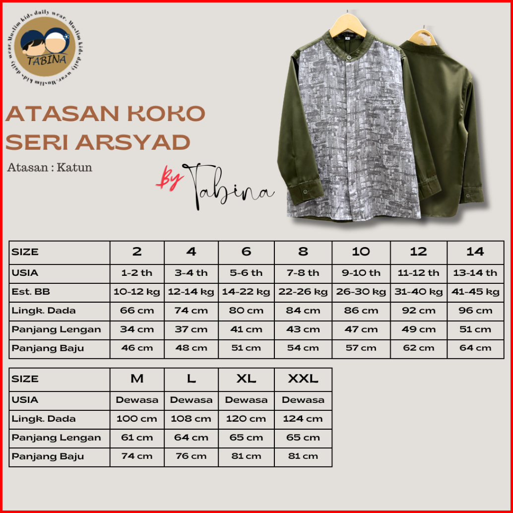 Atasan Kemeja Koko Anak Lengan Pendek Panjang Tabina Seri Arsyad Usia 2 Hingga 16 Tahun