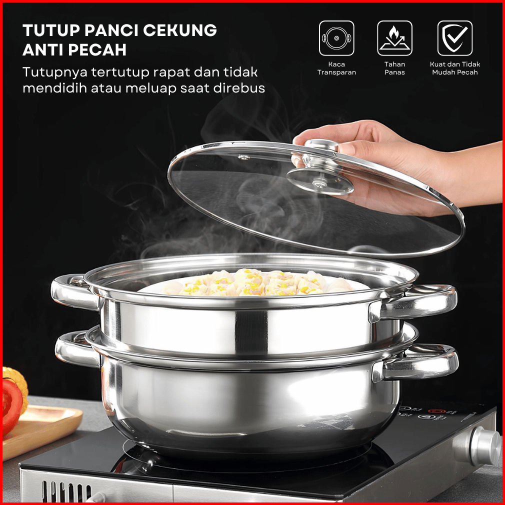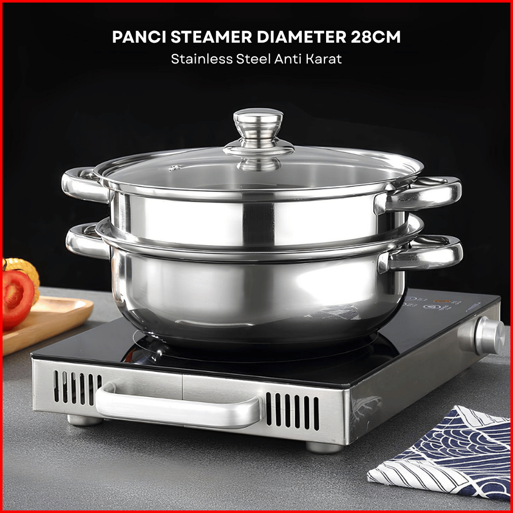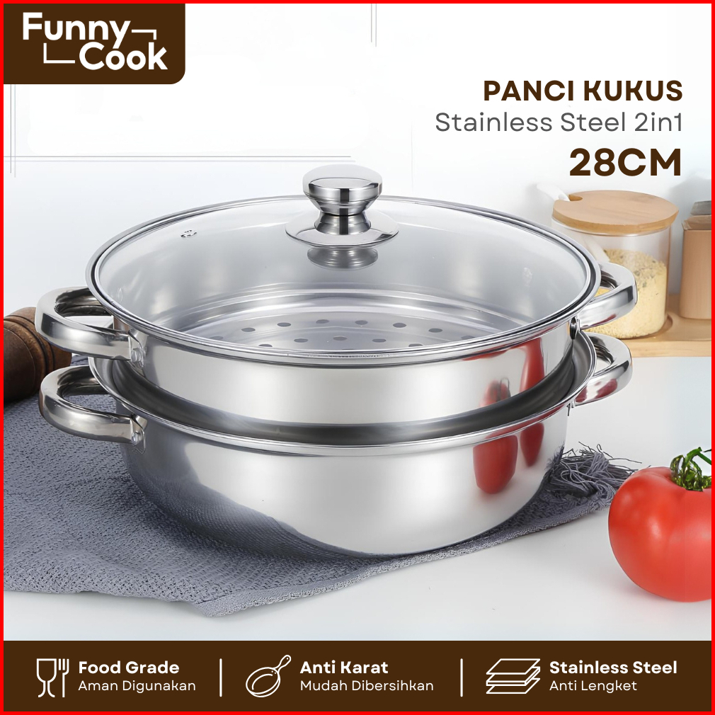 Funnycook Panci Kukus Set Stainless Steel Panci Sup Steamer Ikan Bakpao Siomay 2 Susun 28cm Tebal