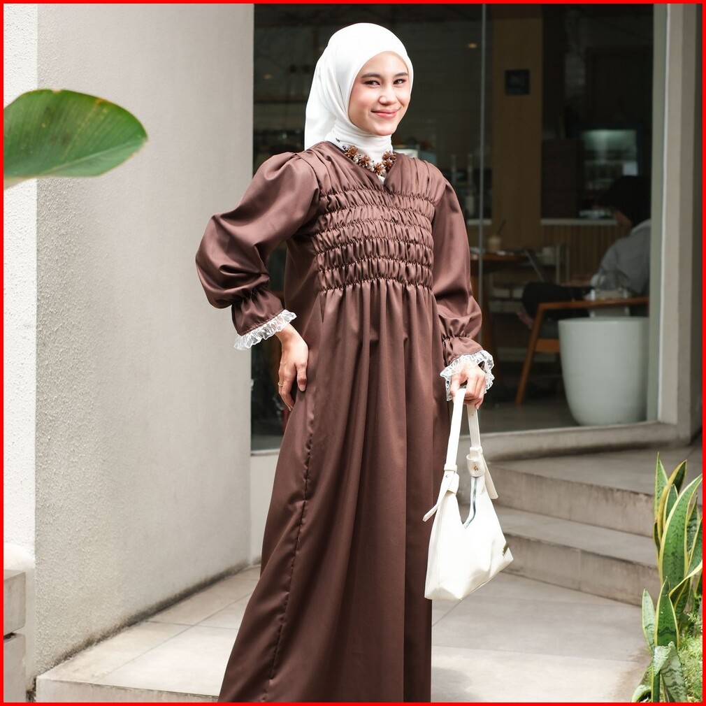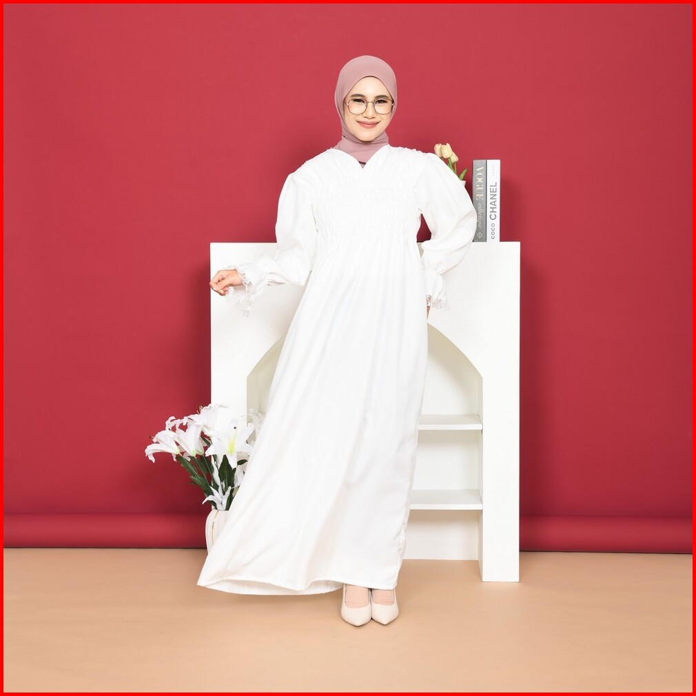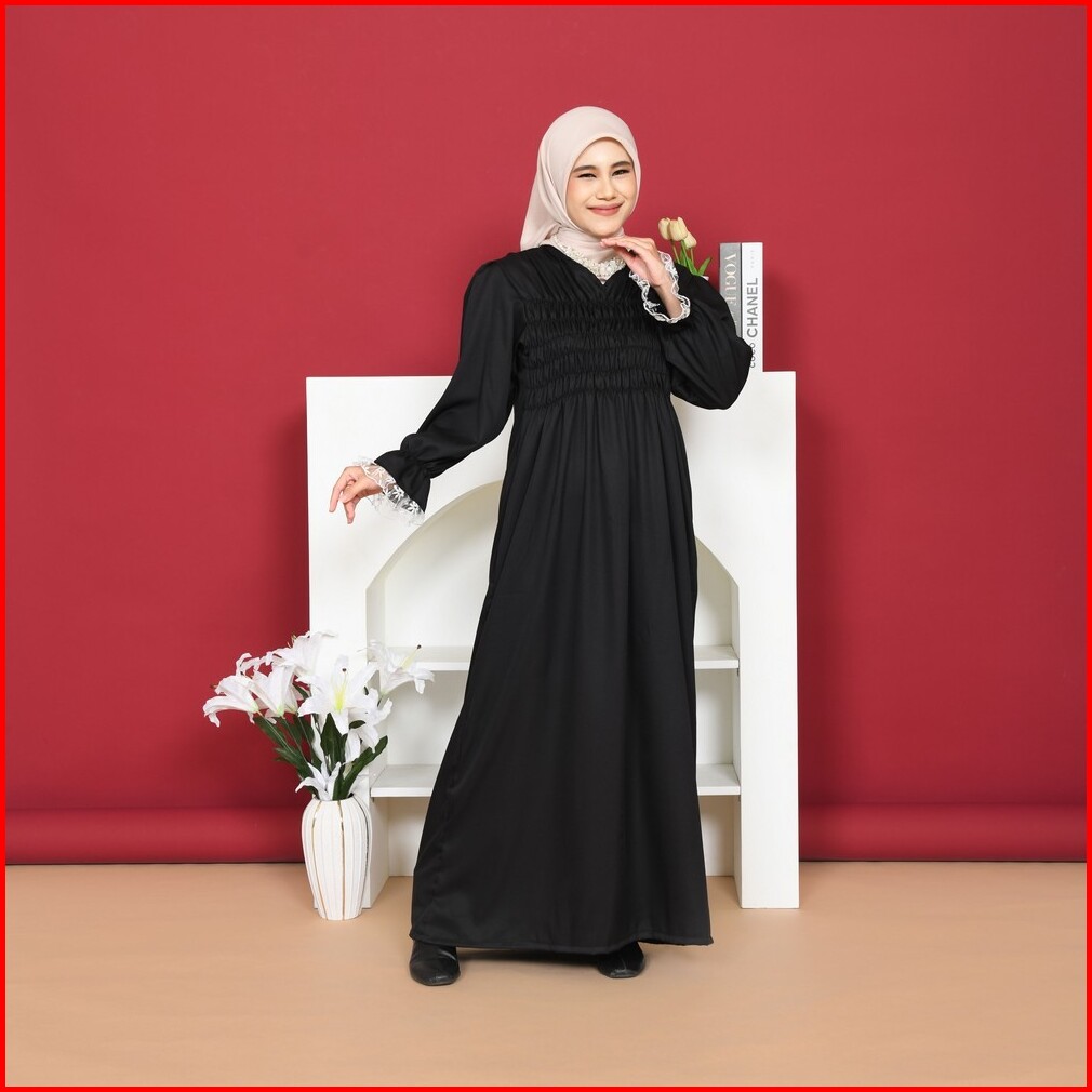 Mybamus Eliana Rubber Dress Lebaran Kerut Dada Renda Lengan Panjang