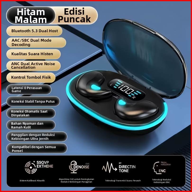 Rccor Wireless Earbuds Bluetooth 5.3 Koneksi Super Stabil - Baterai Tahan Hingga 4 Hari Suara Hi-fi Stereo - No Lag