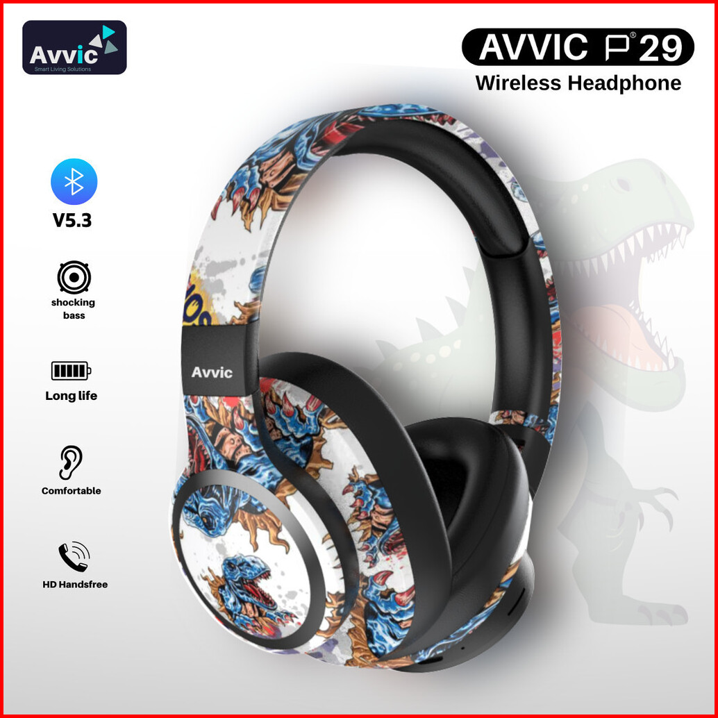 Avvic P29 Headphone Bluetooth Wireless Headset Full Print Dino Hifi Stereo Powerful Bass Hd Sound