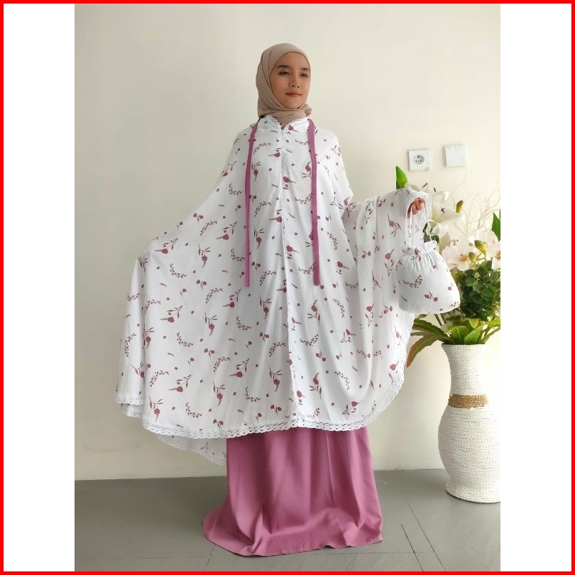 Mukena Rayon Putih Bermotip Model Resleting 2 In 1 Free Tas Cantik