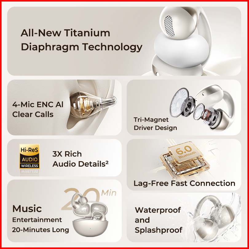 Htc Ne56 True Wireless Bluetooth Headset V6.0 Headset Bluetooth Terjemahan Ai Ows Tws Open Ear Earphone Tws Ear Clip Hea