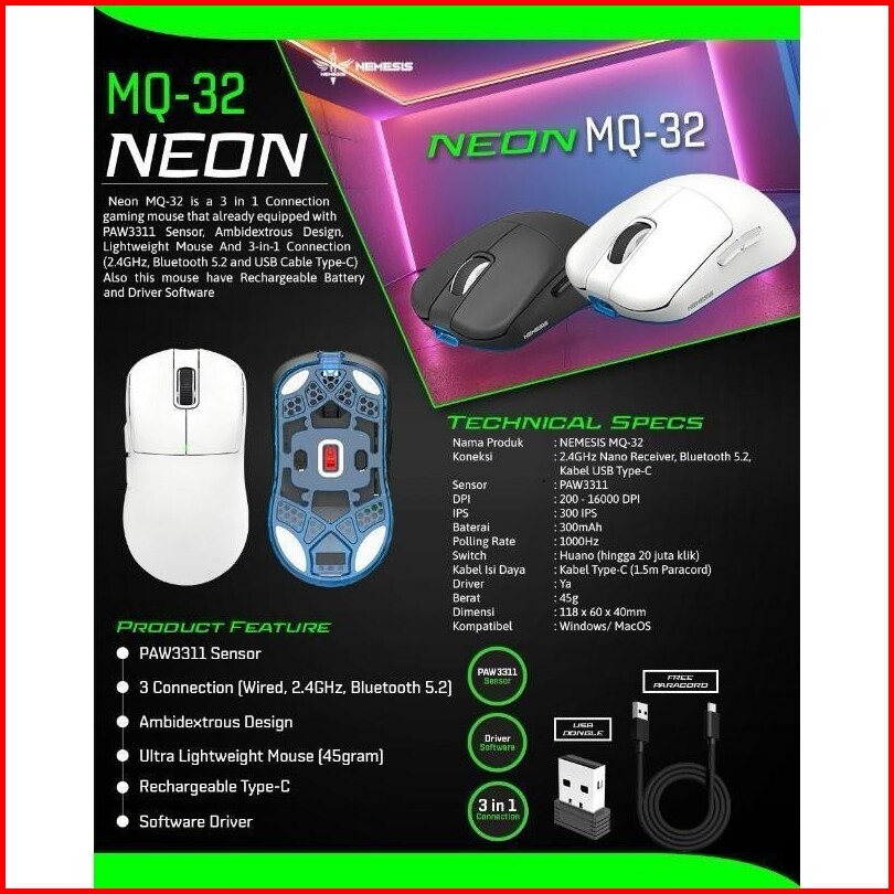 Nyk Nemesis Neon Mq32 Mq-32 Gaming Mouse Lightweight Paw3311 Wireless 2.4ghz Tri-mode Connection