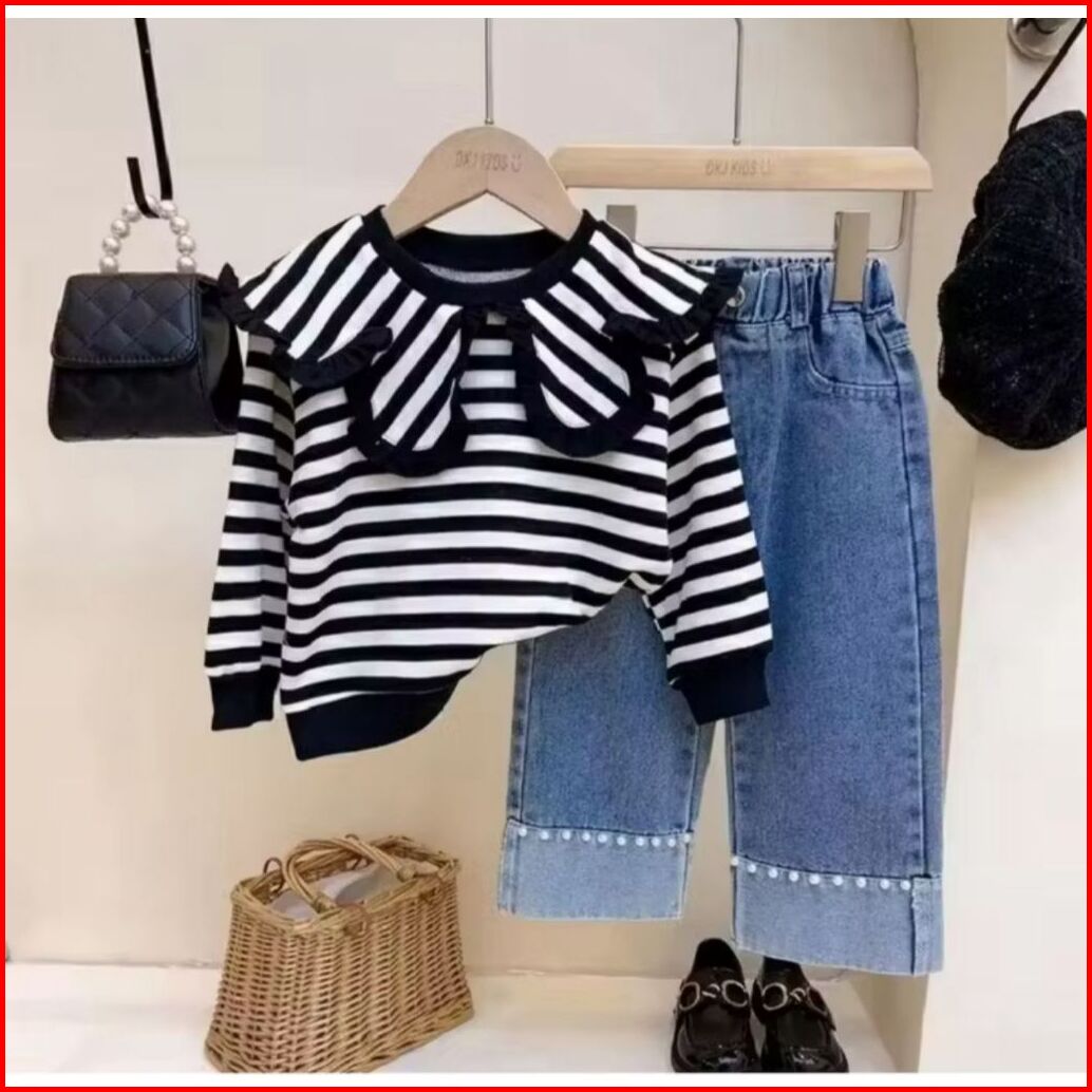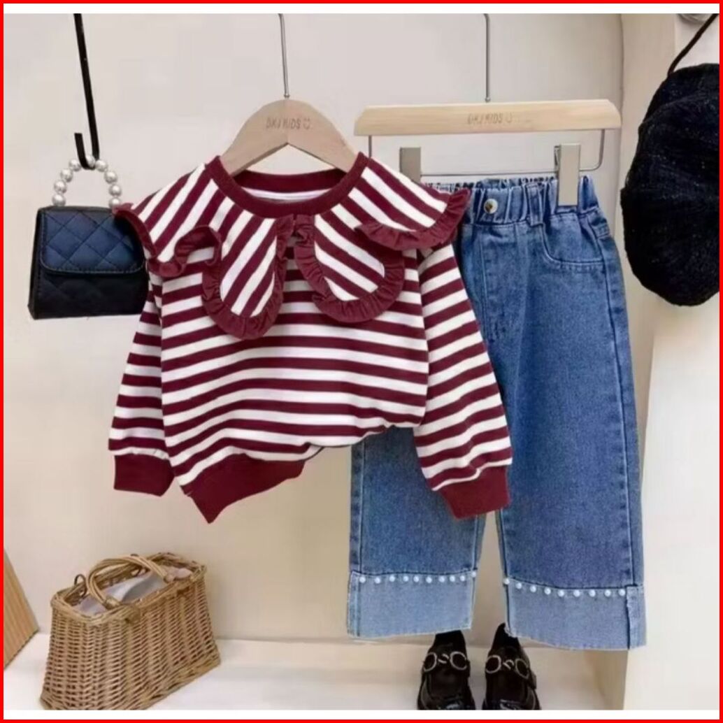 Setelan Anak Perempuan Lucu Usia 1-5 Tahun Atasan Ruffle Salur Cantik Celana Jeans Mutiara Fashion Anak Korean Style Out