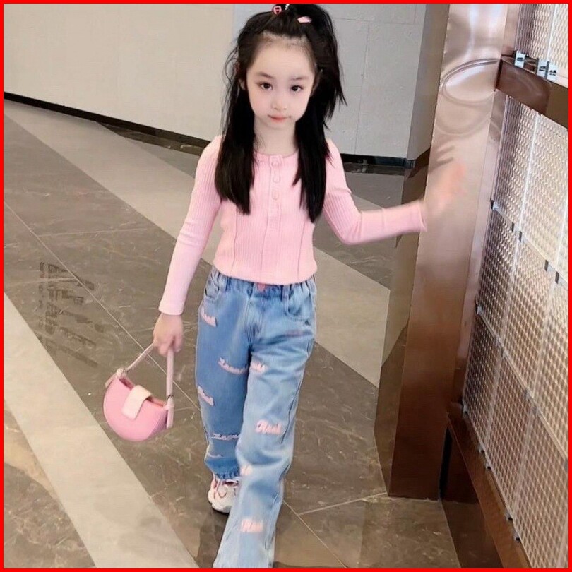 Chubbi 25 - Setelan Set Anak Korea Pink Rajut Kancing Celana Jeans Bordir Timbul