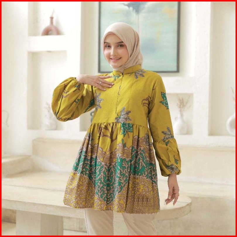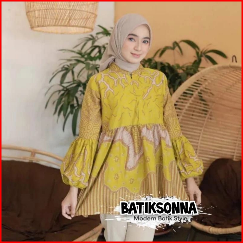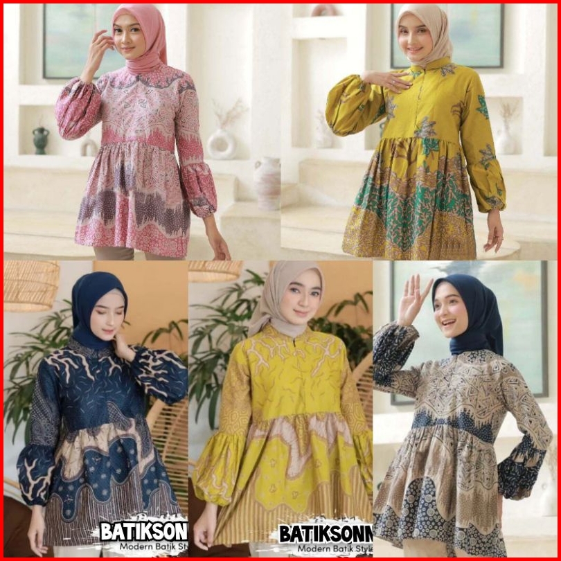Atasan Wanita Blouse Batik Kerja Wanita Modern Motif Bunga Lengan Balon Katun Ready Batik Wanita Jumbo