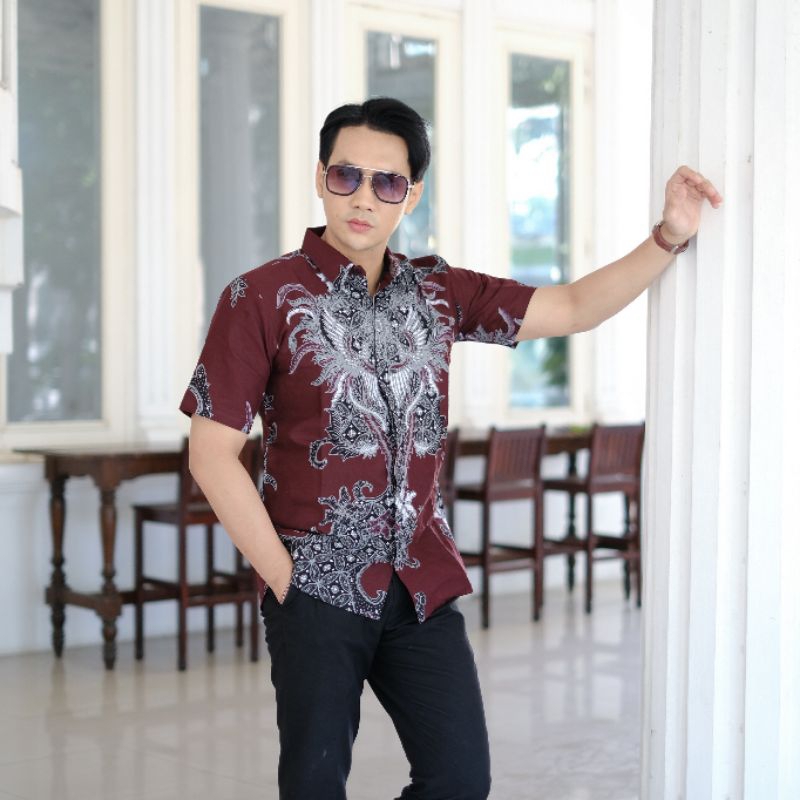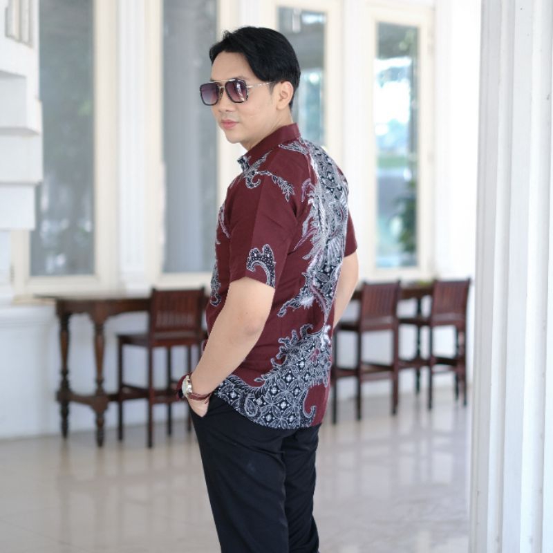 Warna Merah Bergundi Kemeja Batik Pria Slimfit Lengan Pendek Lapis furing Motif Bergundy Baju Batik Pria Slimfit Jumbo