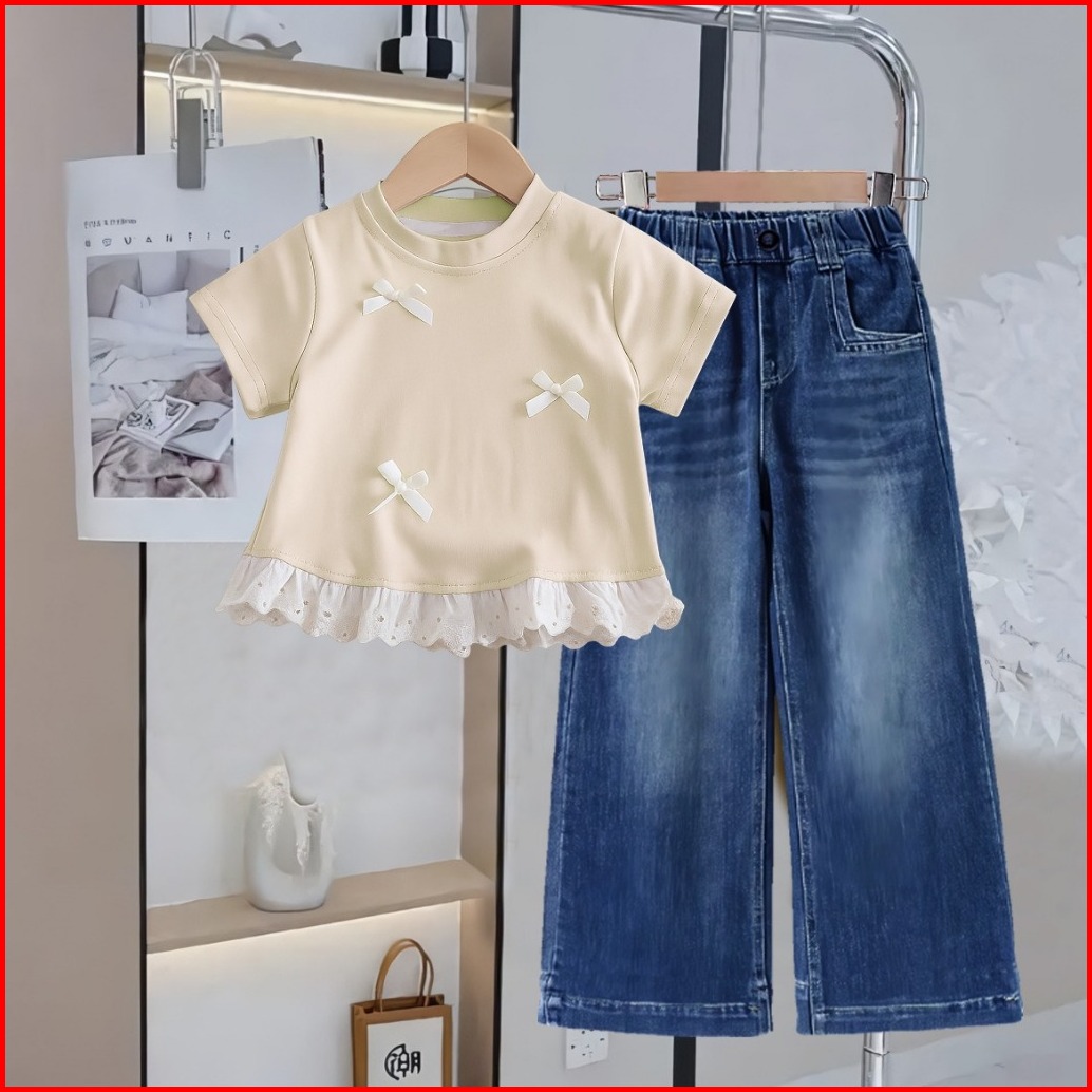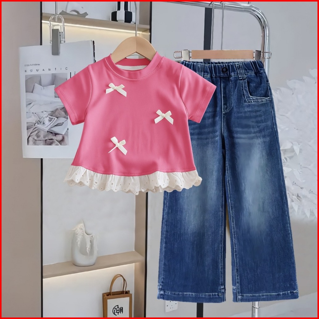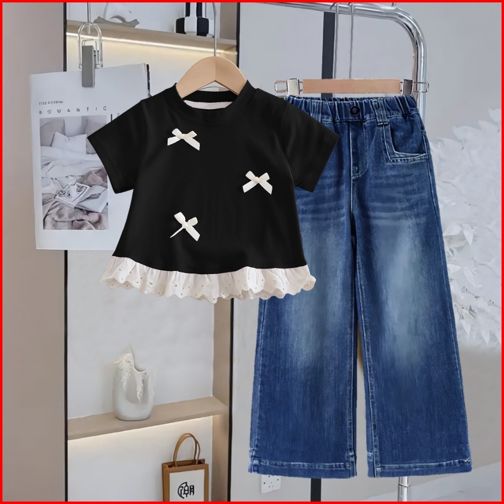 Baju Setelan Anak Perempuan Kaos Renda Pita Celana Jeans Kulot Panjang Usia 1-12 Tahun