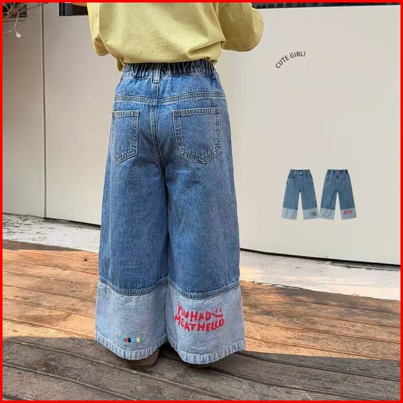 Korea Style Setelan Jeans Anak Perempuan One Set Atasan Bahan Katun Motif Lucu Celana Jeans Kulot Motif Lucu Baju Anak