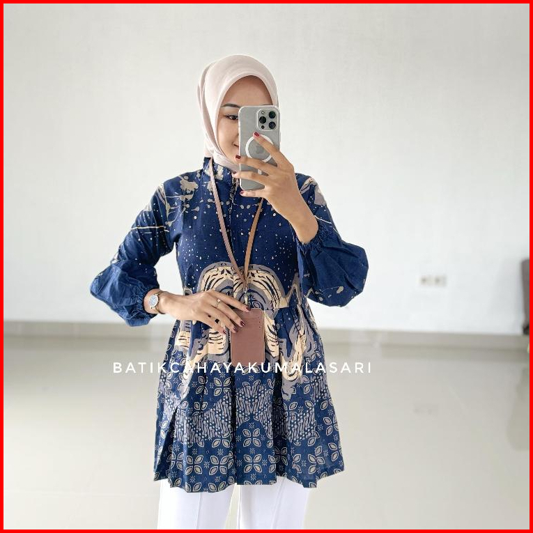 Blouse Batik Wanita Lengan Balon Motif Jenna Navy - Atasan Kerja Wanita Bahan Katun Prima
