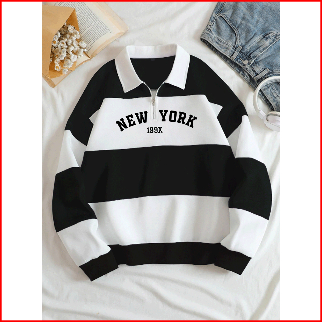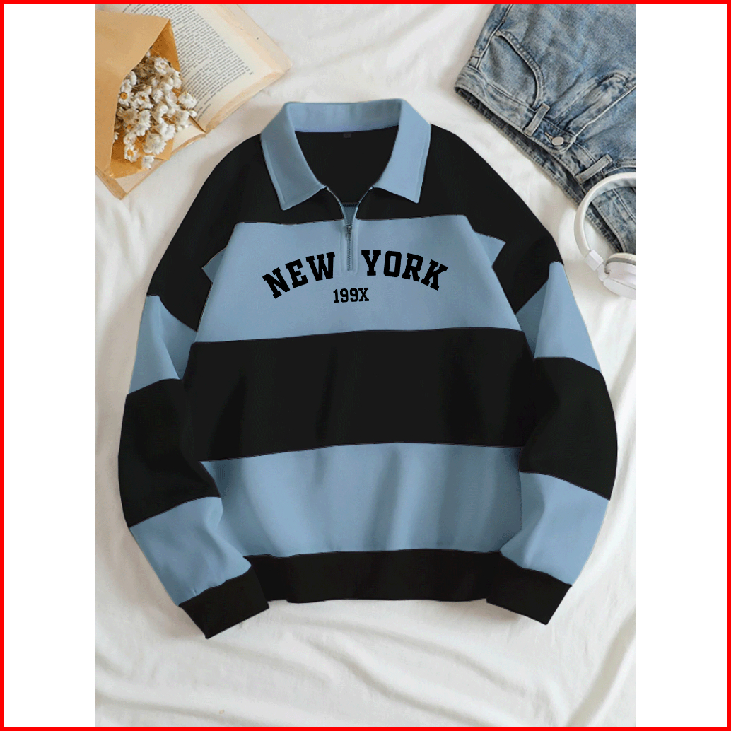 Dijaketan Sweater Rugby Wanita Neywyork Salur Kombinasi Sweater Kerah Resleting Sweater Halfzip Lengan Panjang Korean St