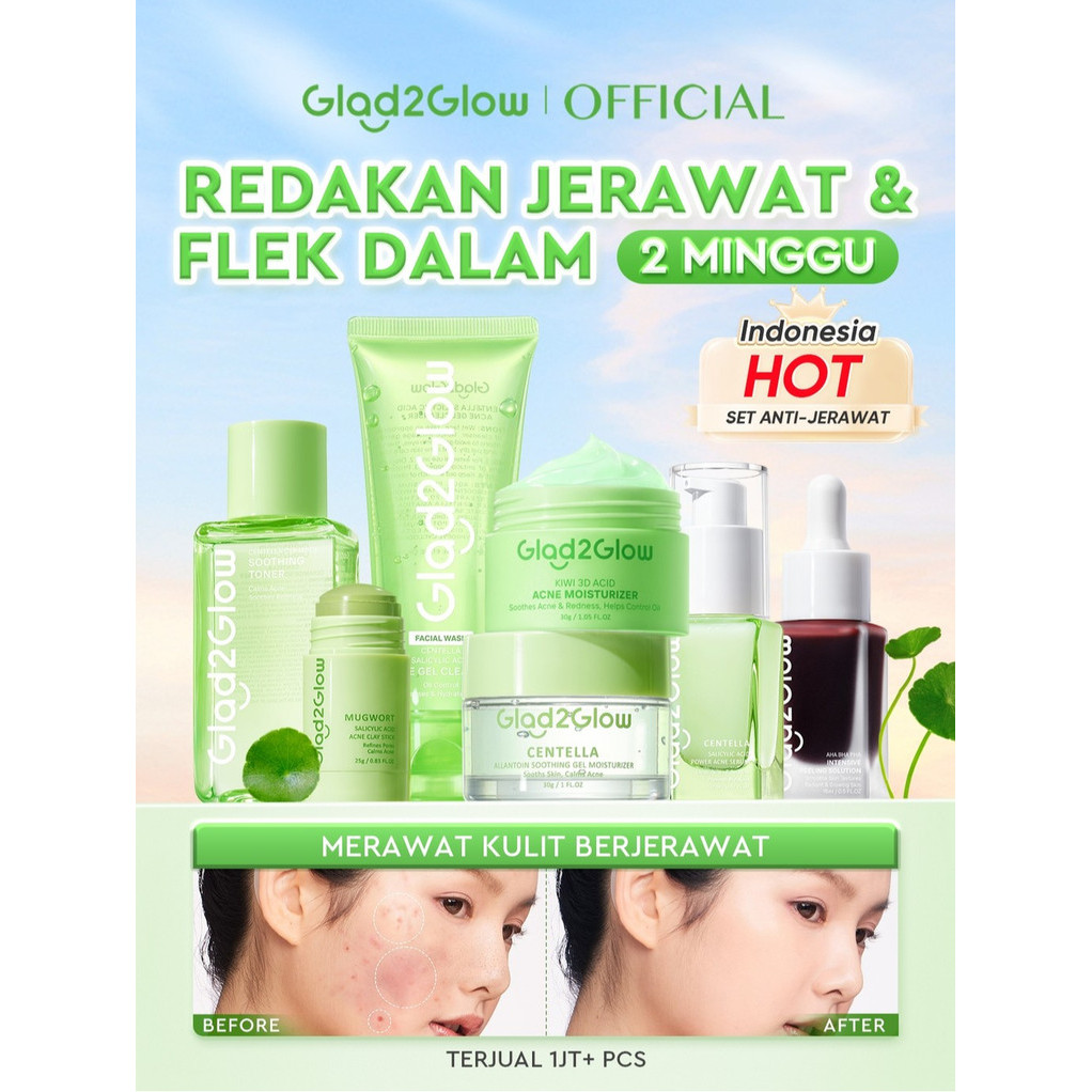 Glad2Glow Paket Acne Jerawat Bundle 7in1 paket Centella madeca cream-Moisturizer+Serum+Cleanser+Toner+Clay Stick+Gel Ski