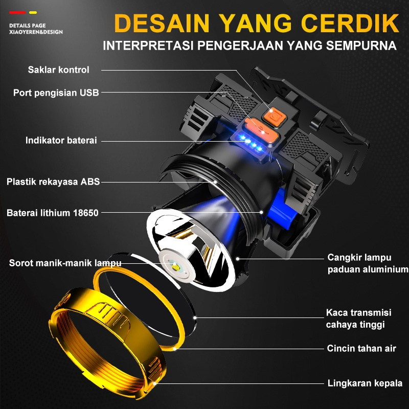 Senter Kepala LED Headlamp 300W Super Terang Outdoor Camping Berburu Hiking USB Rechargeable IPX4 Tahan Air
