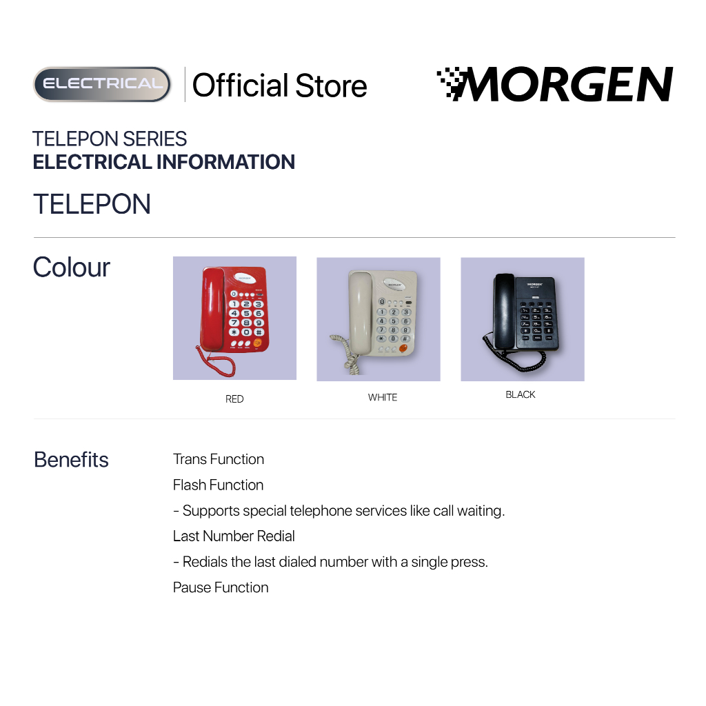 Morgen Telepon Series - Telepon Kabel Rumah Kantor Hotel Fitur Trans Flash Redial Pause